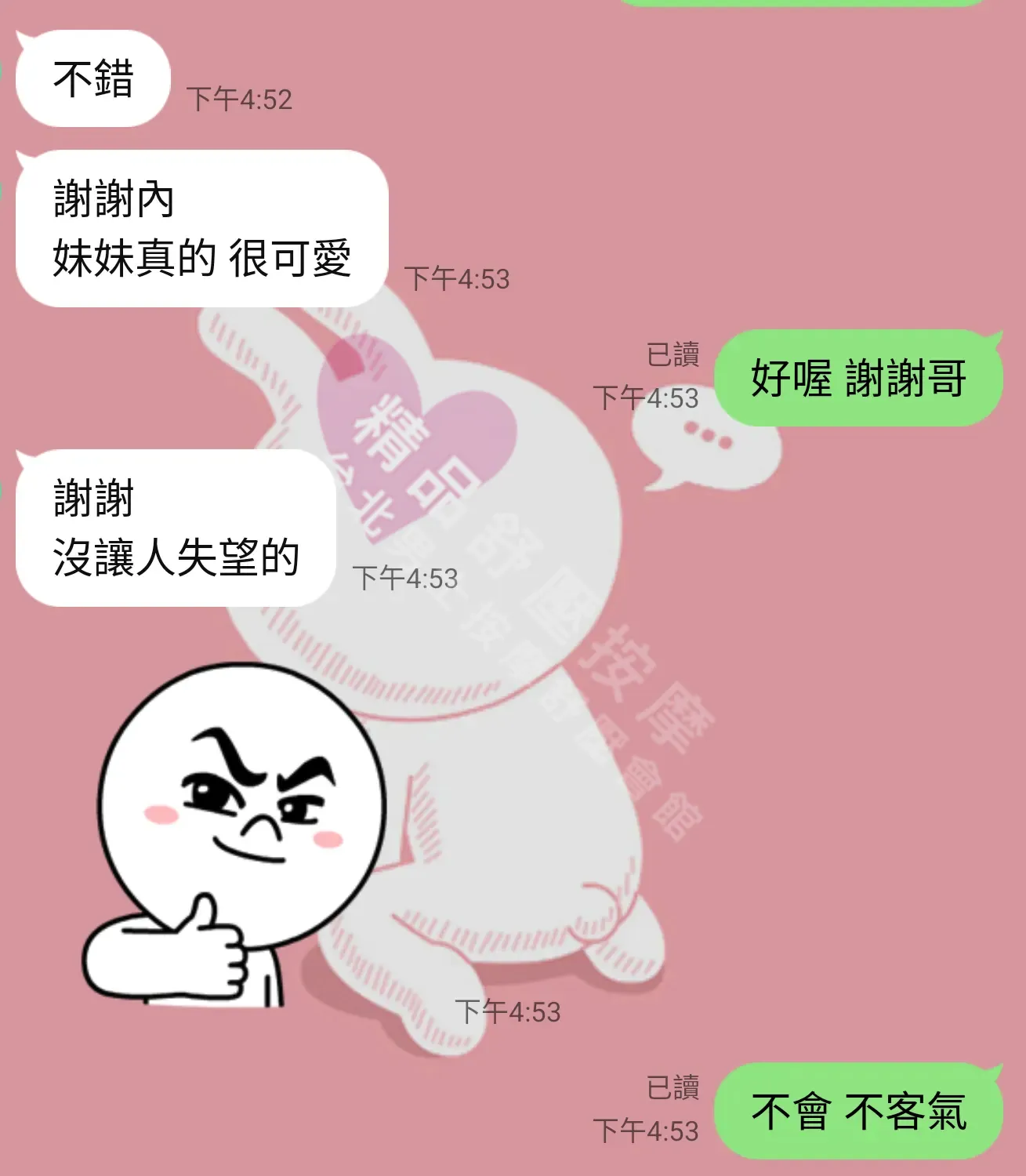 美容師都很有禮貌,先幫你背部按摩聊聊天,前戲會開始調情輕功,再來就是重點部位的加強。如果預算,也可以跟美容師聊聊加值服務,放心問都有機會。精品舒壓期待每位客人每次來舒壓都有個Happy Ending!