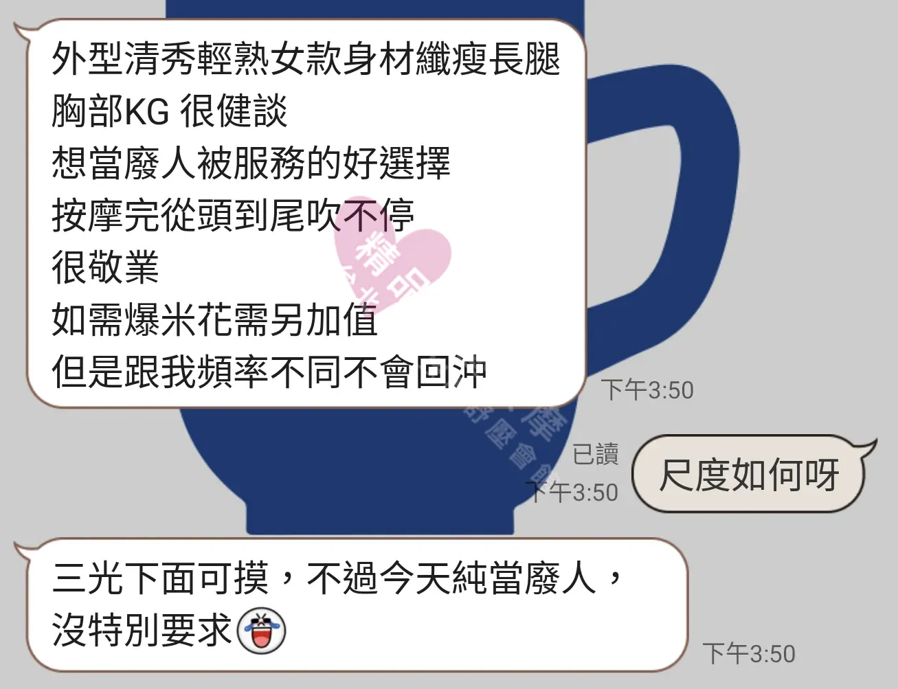 提前跟幹部預約,提出自己對美容師的要求,例如是大奶、長腿又或是小隻馬等等,通常幹部都會盡可能滿在你的要求,還可以選擇想要怎麼玩,是否可以加值更多的服務等等,這些都能通過幹部來提前預約實現。