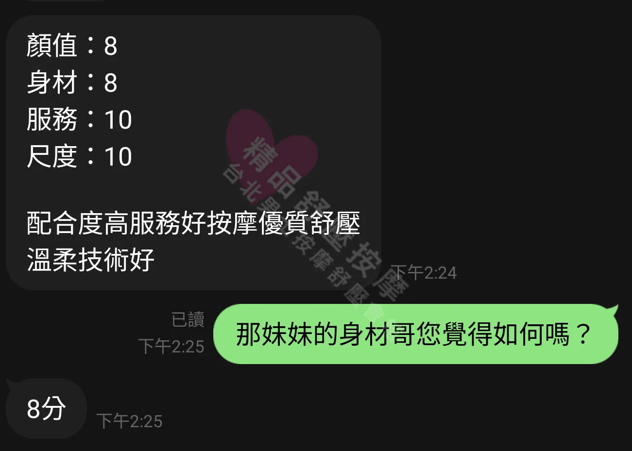 美容師都很有禮貌,先幫你背部按摩聊聊天,前戲會開始調情輕功,再來就是重點部位的加強。如果預算,也可以跟美容師聊聊加值服務,放心問都有機會。精品舒壓期待每位客人每次來舒壓都有個Happy Ending!