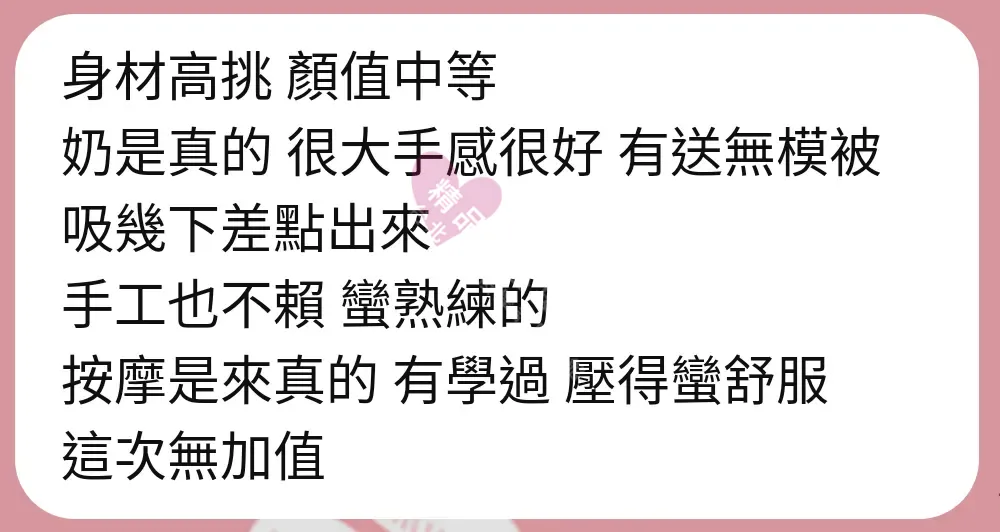 美容師都很有禮貌,先幫你背部按摩聊聊天,前戲會開始調情輕功,再來就是重點部位的加強。如果預算,也可以跟美容師聊聊加值服務,放心問都有機會。精品舒壓期待每位客人每次來舒壓都有個Happy Ending!