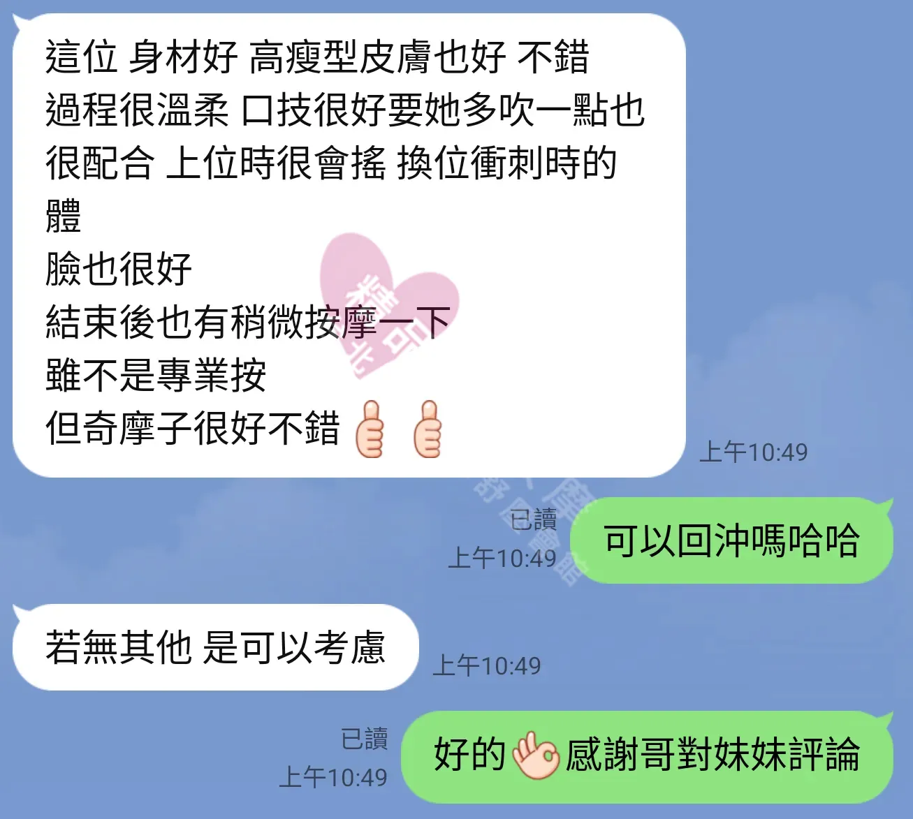美容師都很有禮貌,先幫你背部按摩聊聊天,前戲會開始調情輕功,再來就是重點部位的加強。如果預算,也可以跟美容師聊聊加值服務,放心問都有機會。精品舒壓期待每位客人每次來舒壓都有個Happy Ending!