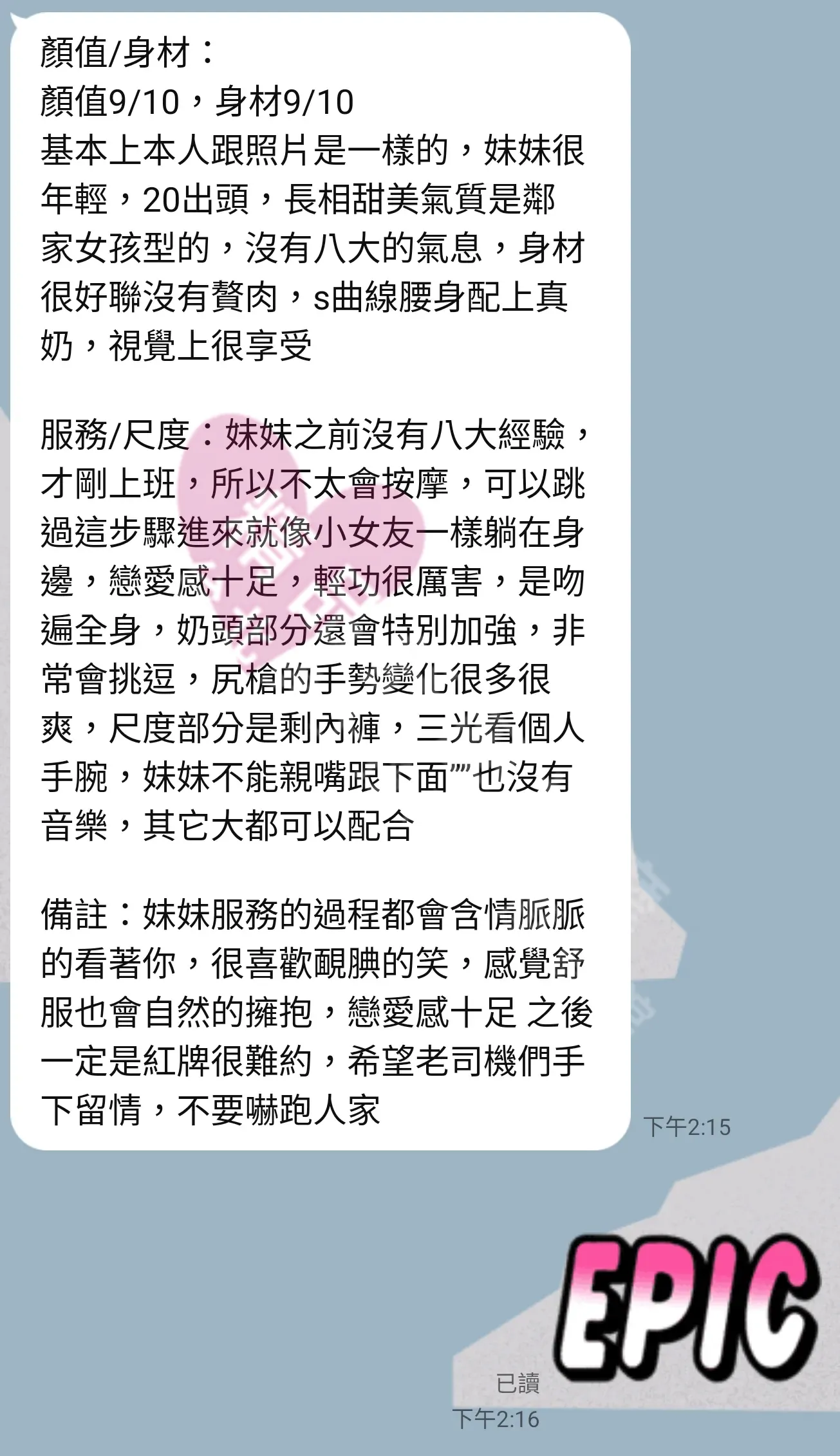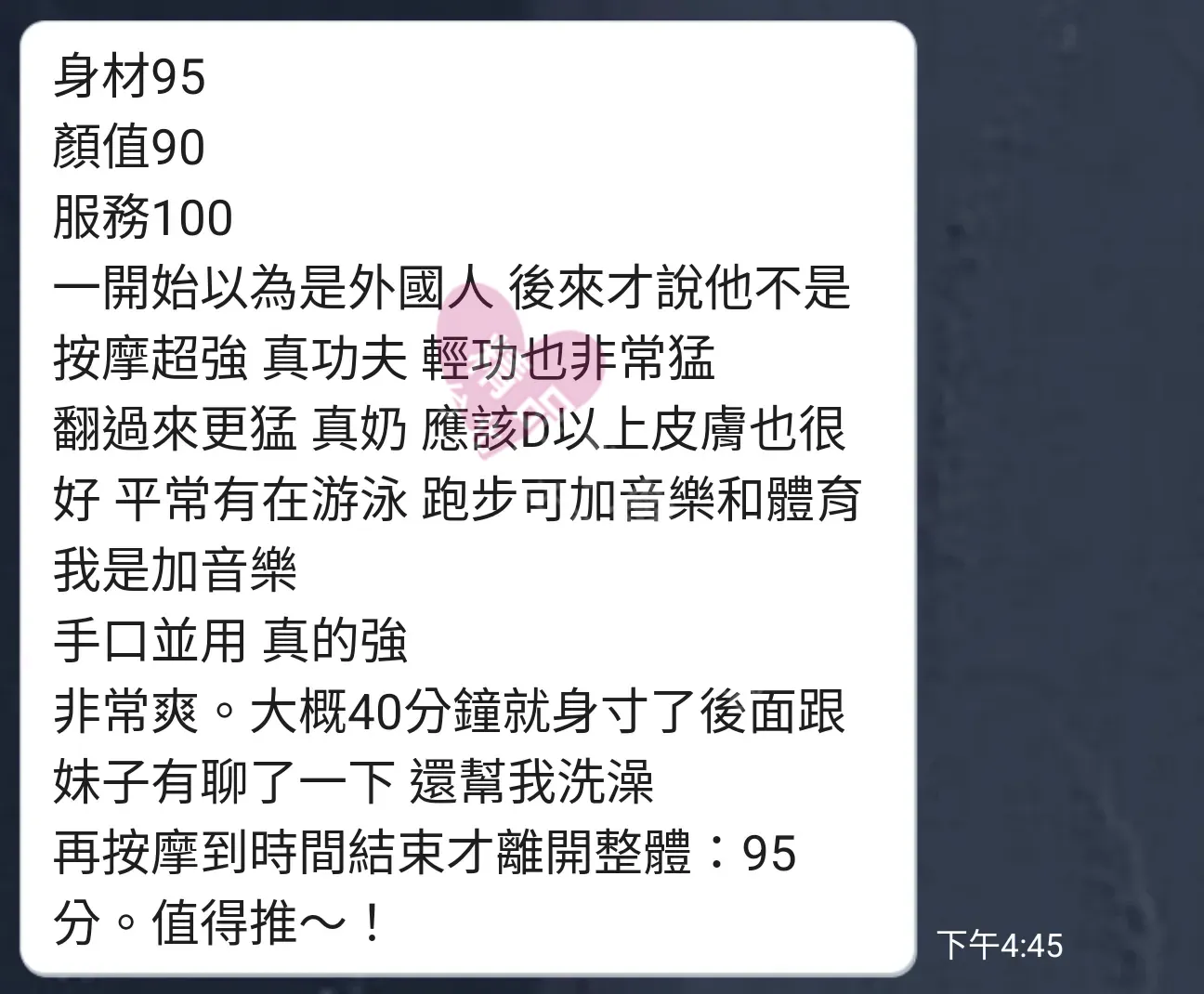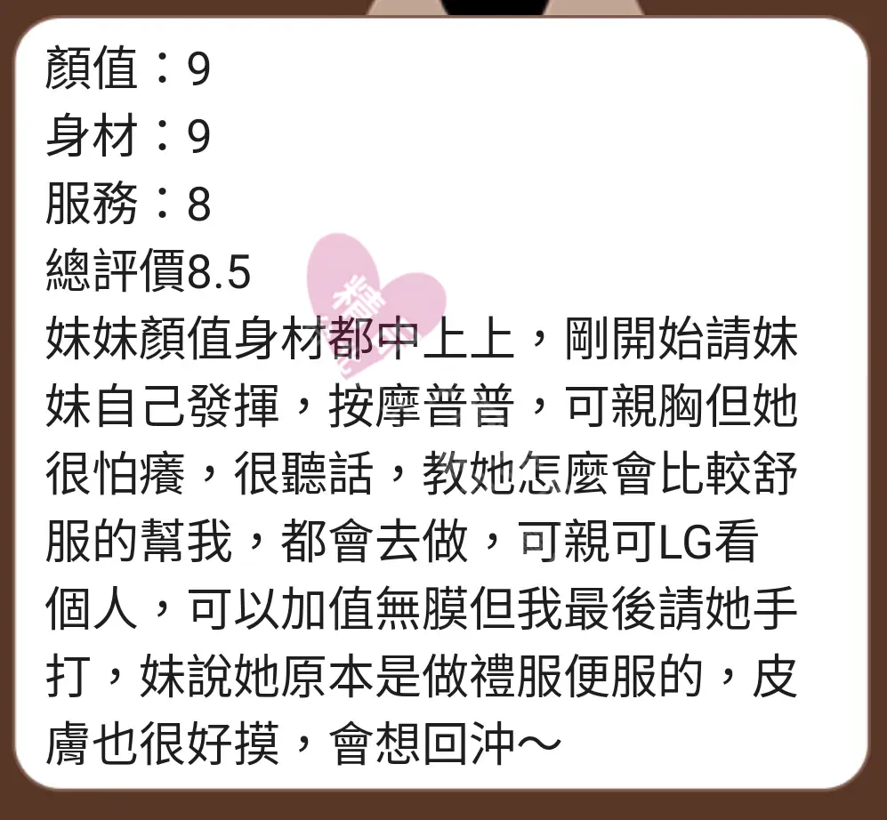 美容師都很有禮貌,先幫你背部按摩聊聊天,前戲會開始調情輕功,再來就是重點部位的加強。如果預算,也可以跟美容師聊聊加值服務,放心問都有機會。精品舒壓期待每位客人每次來舒壓都有個Happy Ending!