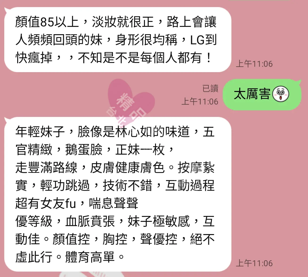 美容師都很有禮貌,先幫你背部按摩聊聊天,前戲會開始調情輕功,再來就是重點部位的加強。如果預算,也可以跟美容師聊聊加值服務,放心問都有機會。精品舒壓期待每位客人每次來舒壓都有個Happy Ending!