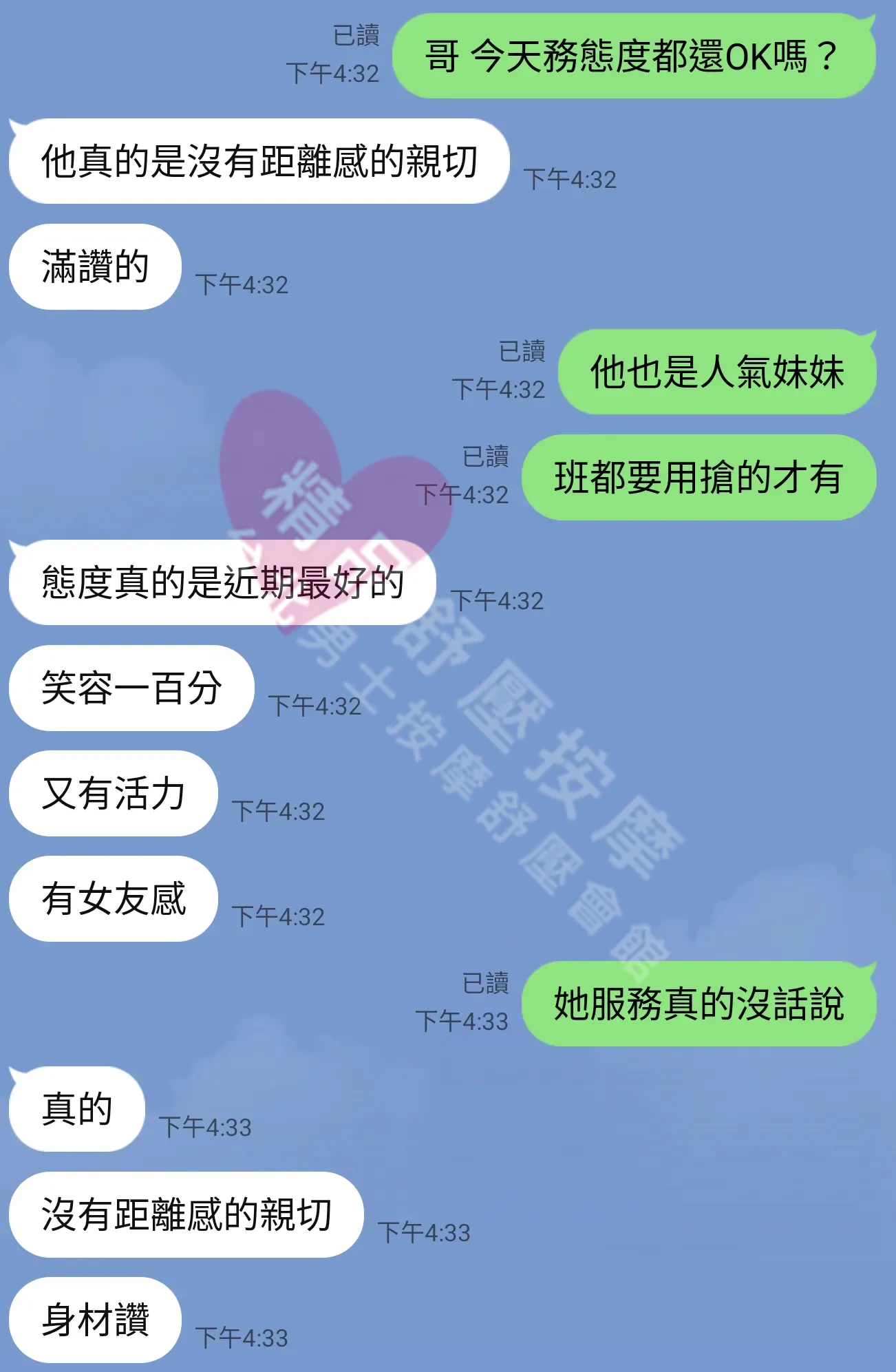 美容師都很有禮貌,先幫你背部按摩聊聊天,前戲會開始調情輕功,再來就是重點部位的加強。如果預算,也可以跟美容師聊聊加值服務,放心問都有機會。精品舒壓期待每位客人每次來舒壓都有個Happy Ending!