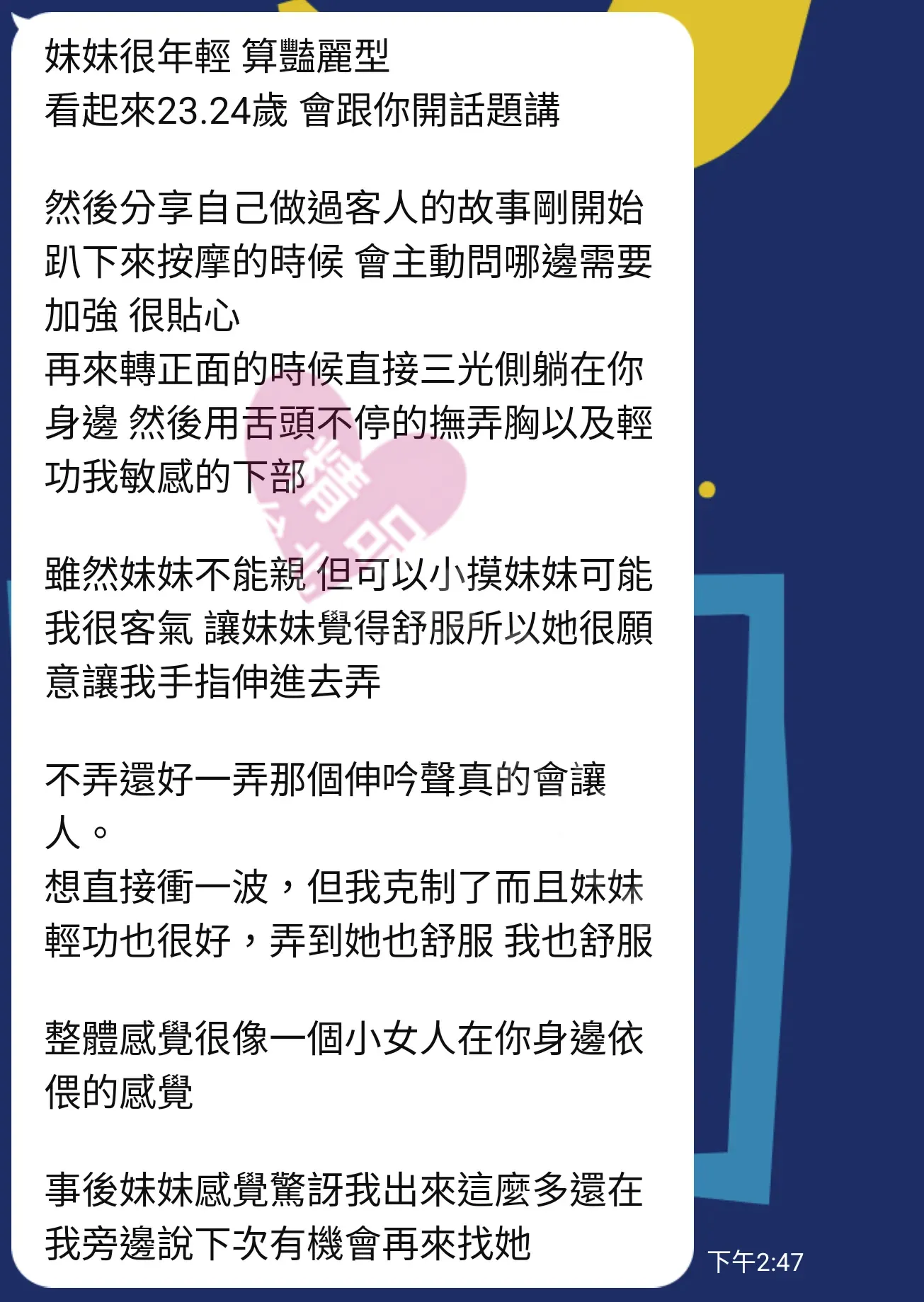 美容師都很有禮貌,先幫你背部按摩聊聊天,前戲會開始調情輕功,再來就是重點部位的加強。如果預算,也可以跟美容師聊聊加值服務,放心問都有機會。精品舒壓期待每位客人每次來舒壓都有個Happy Ending!