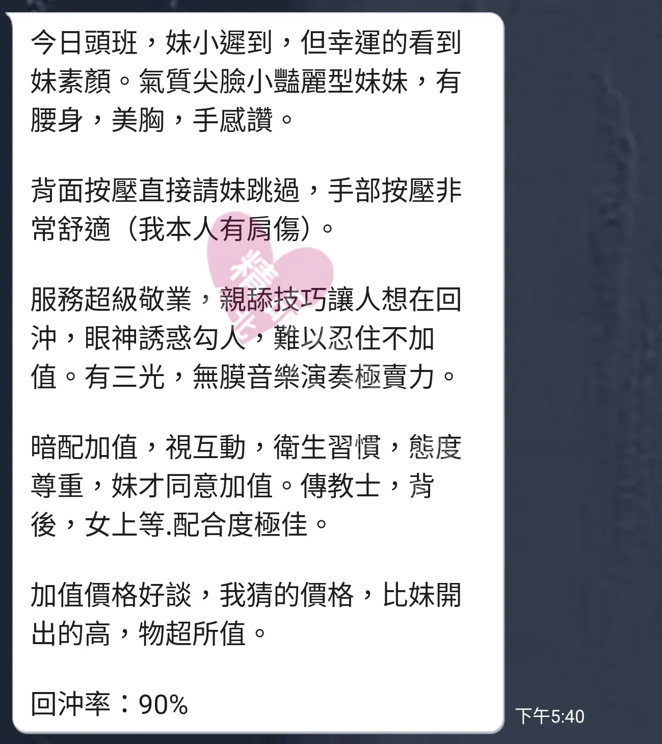 美容師都很有禮貌,先幫你背部按摩聊聊天,前戲會開始調情輕功,再來就是重點部位的加強。如果預算,也可以跟美容師聊聊加值服務,放心問都有機會。精品舒壓期待每位客人每次來舒壓都有個Happy Ending!