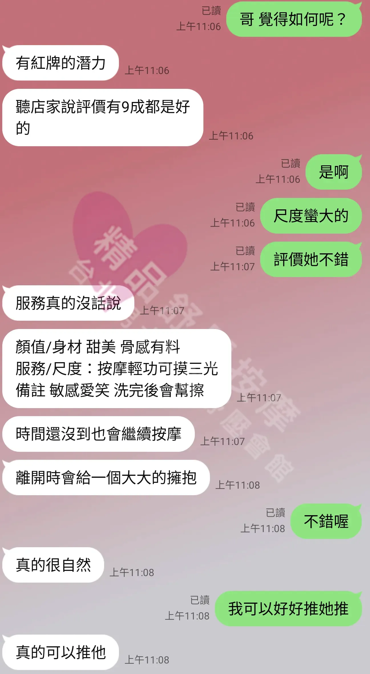 美容師都很有禮貌,先幫你背部按摩聊聊天,前戲會開始調情輕功,再來就是重點部位的加強。如果預算,也可以跟美容師聊聊加值服務,放心問都有機會。精品舒壓期待每位客人每次來舒壓都有個Happy Ending!