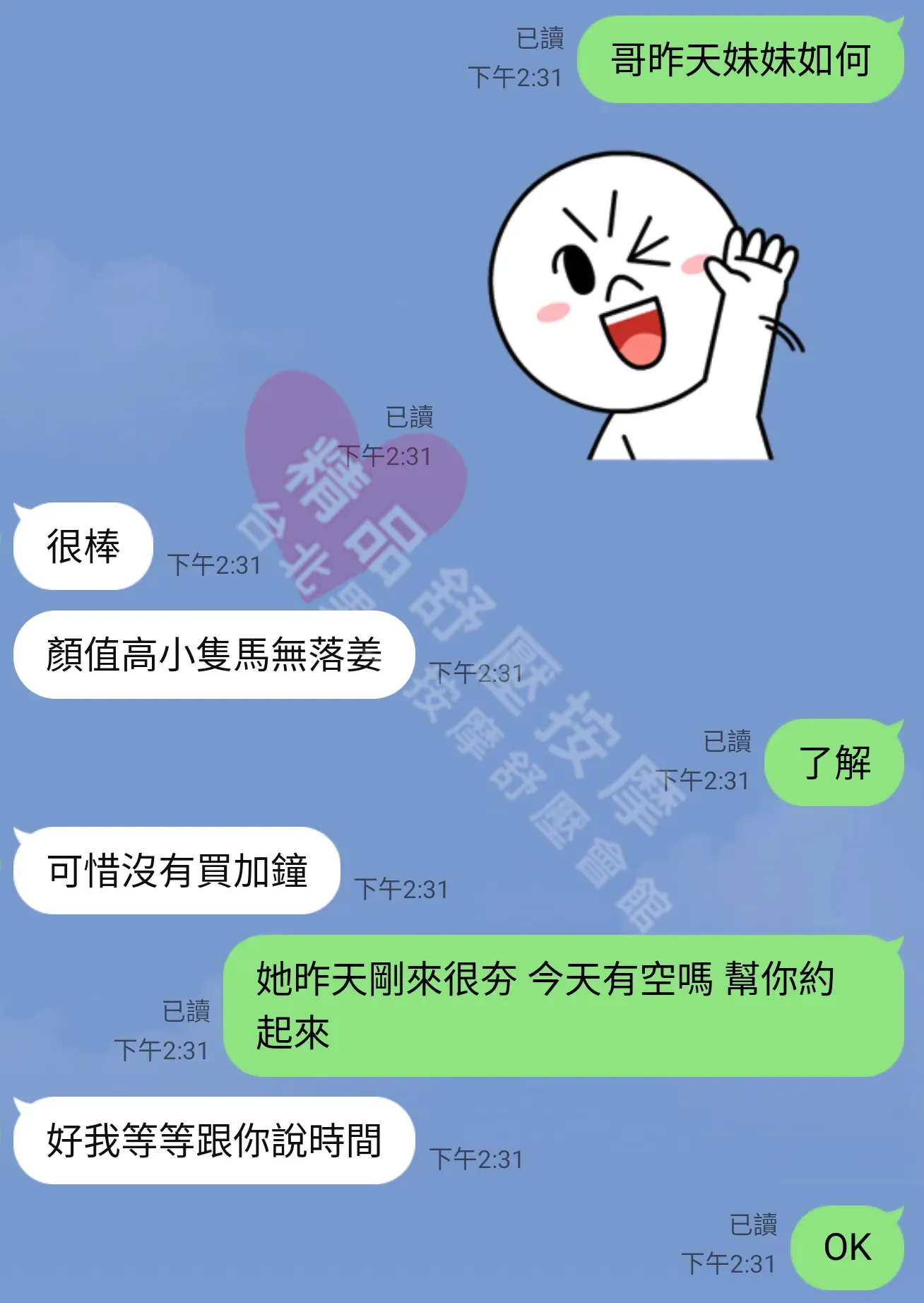 美容師都很有禮貌,先幫你背部按摩聊聊天,前戲會開始調情輕功,再來就是重點部位的加強。如果預算,也可以跟美容師聊聊加值服務,放心問都有機會。精品舒壓期待每位客人每次來舒壓都有個Happy Ending!