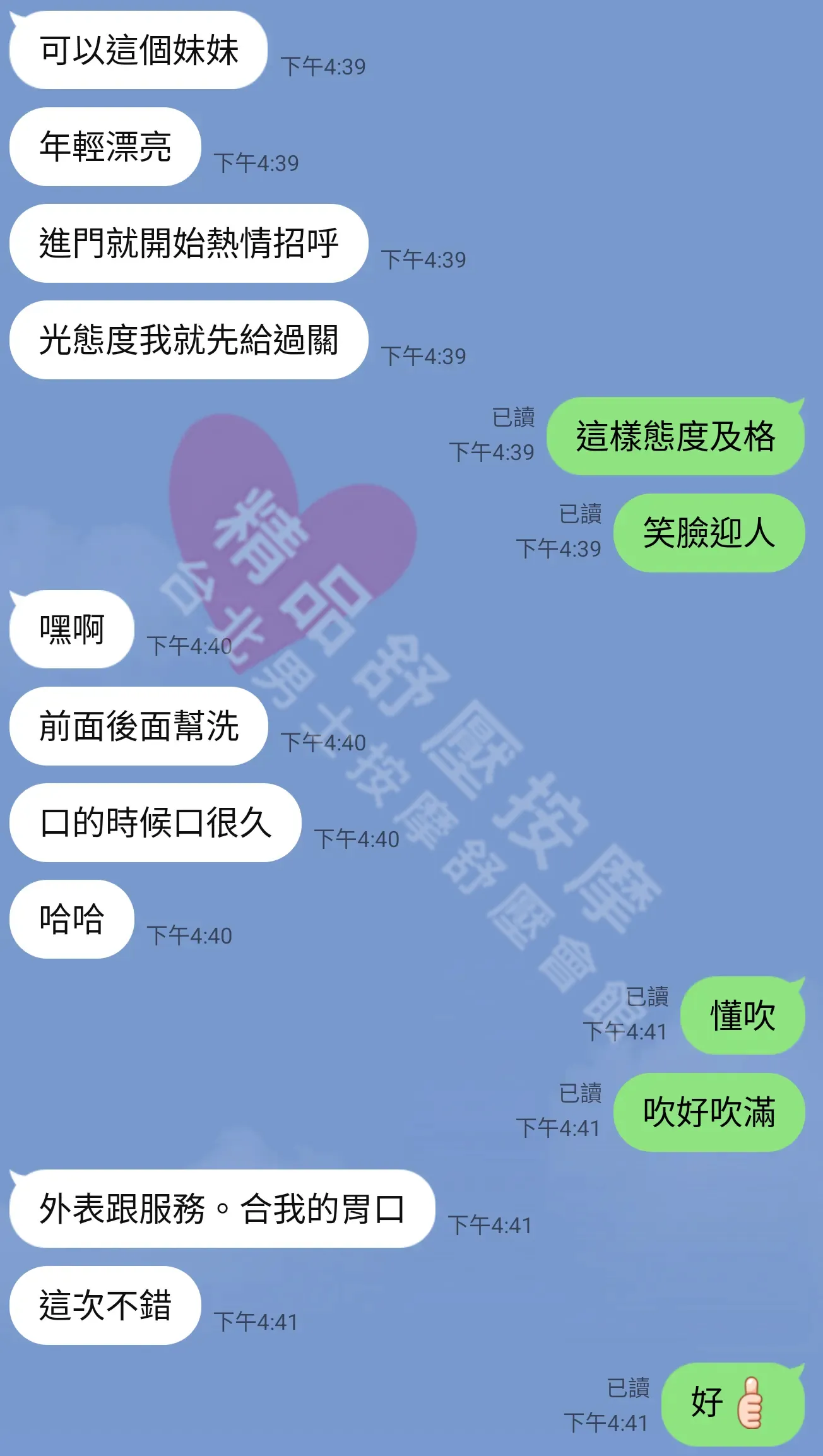 美容師都很有禮貌,先幫你背部按摩聊聊天,前戲會開始調情輕功,再來就是重點部位的加強。如果預算,也可以跟美容師聊聊加值服務,放心問都有機會。精品舒壓期待每位客人每次來舒壓都有個Happy Ending!