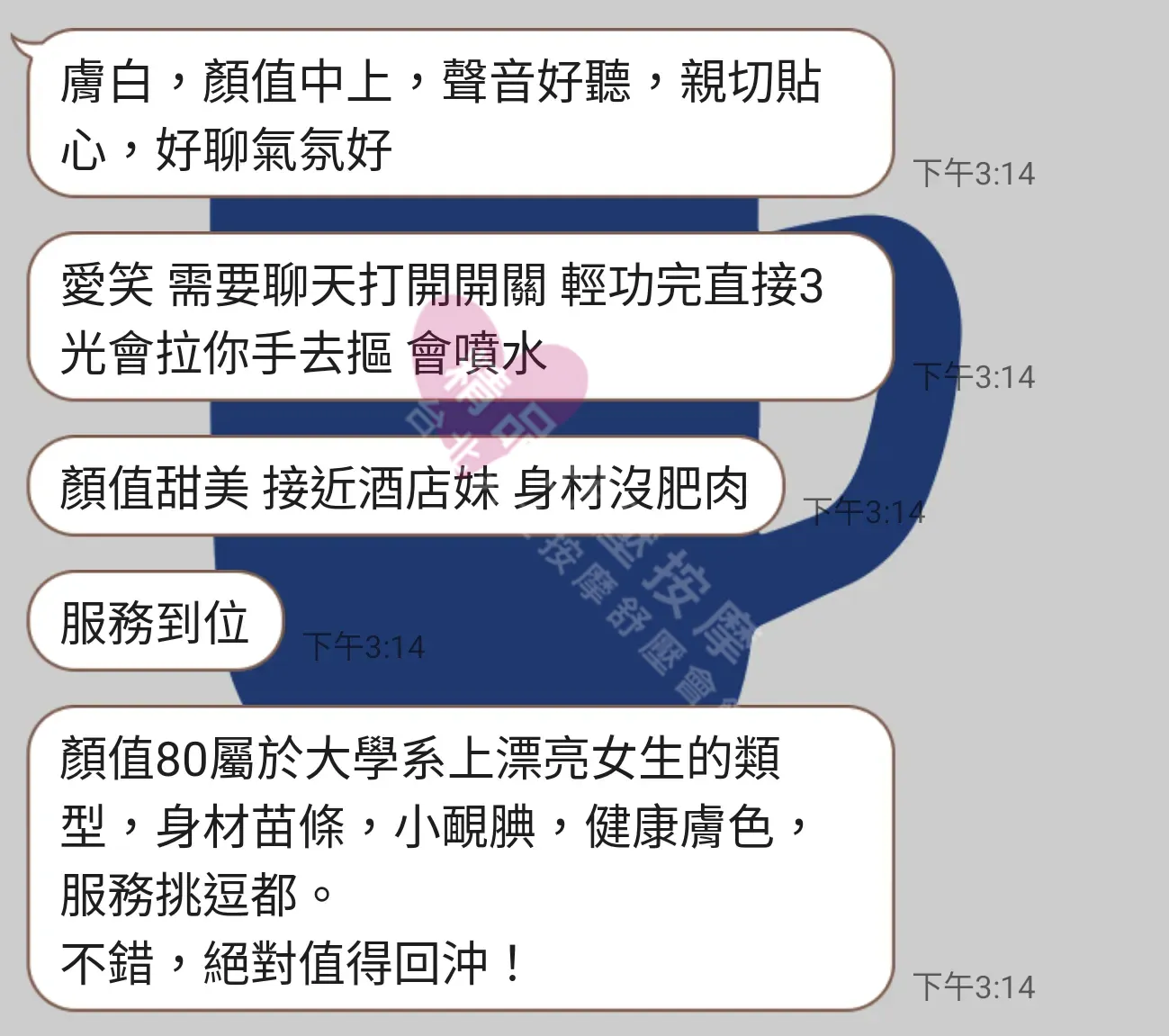 美容師都很有禮貌,先幫你背部按摩聊聊天,前戲會開始調情輕功,再來就是重點部位的加強。如果預算,也可以跟美容師聊聊加值服務,放心問都有機會。精品舒壓期待每位客人每次來舒壓都有個Happy Ending!