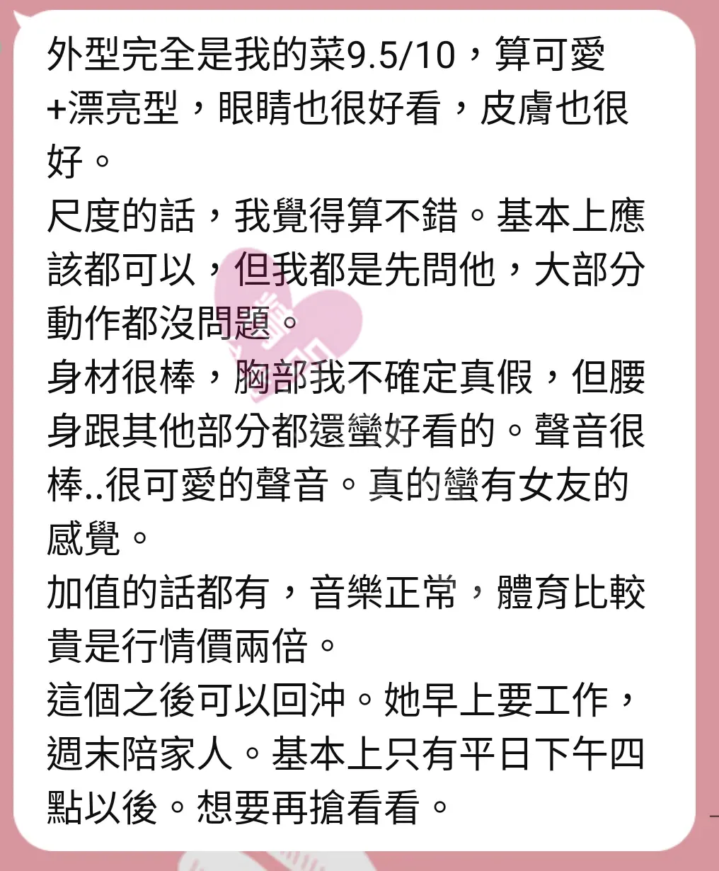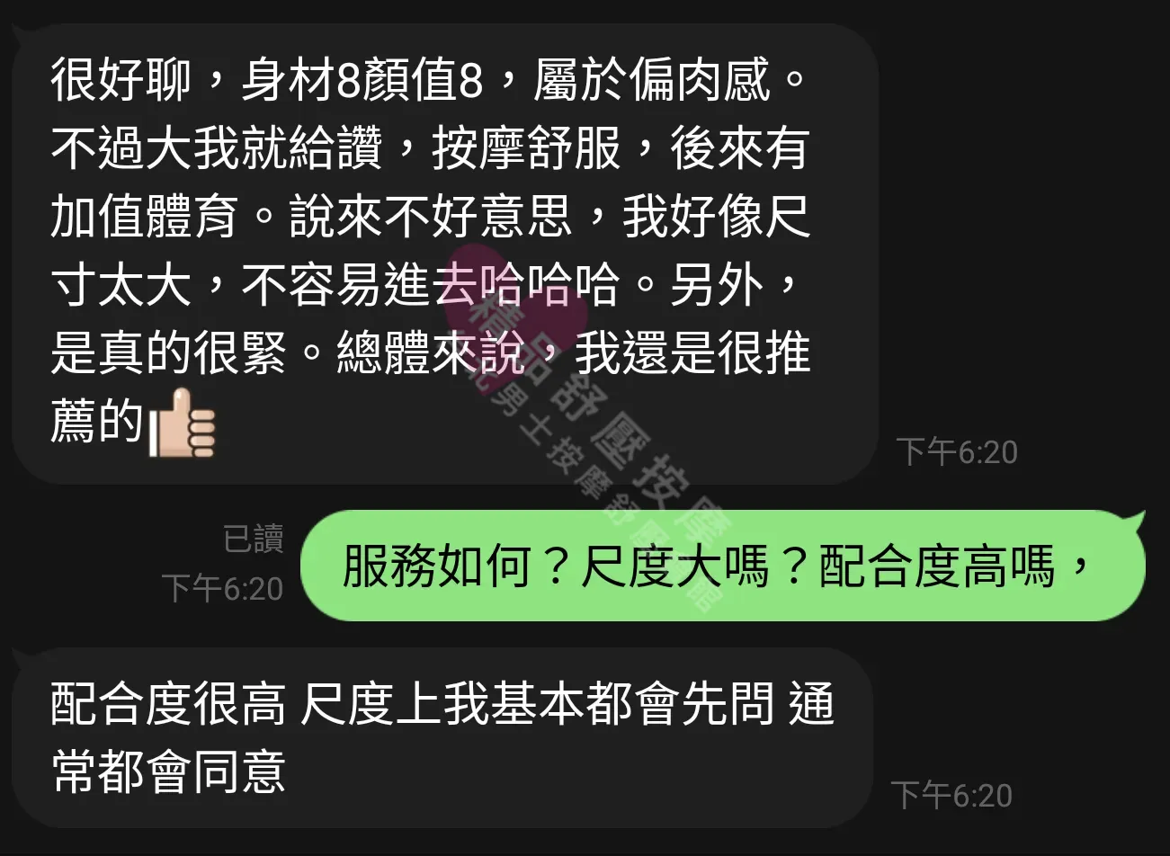 美容師都很有禮貌,先幫你背部按摩聊聊天,前戲會開始調情輕功,再來就是重點部位的加強。如果預算,也可以跟美容師聊聊加值服務,放心問都有機會。精品舒壓期待每位客人每次來舒壓都有個Happy Ending!