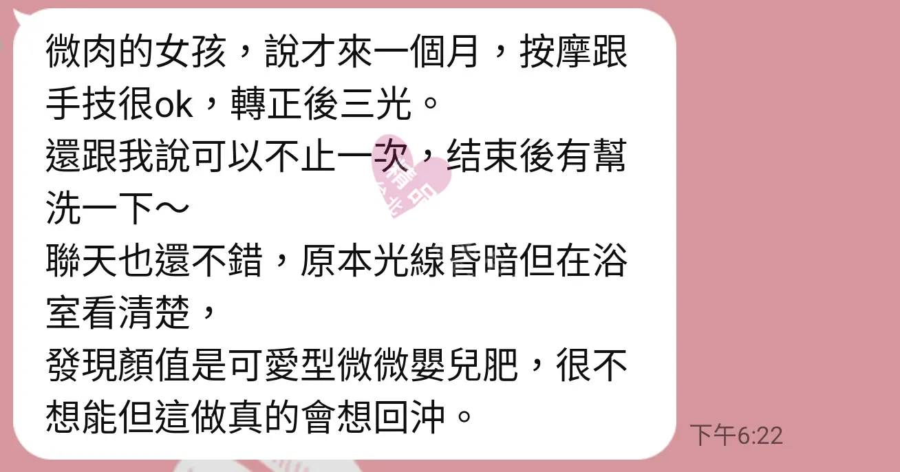 美容師都很有禮貌,先幫你背部按摩聊聊天,前戲會開始調情輕功,再來就是重點部位的加強。如果預算,也可以跟美容師聊聊加值服務,放心問都有機會。精品舒壓期待每位客人每次來舒壓都有個Happy Ending!