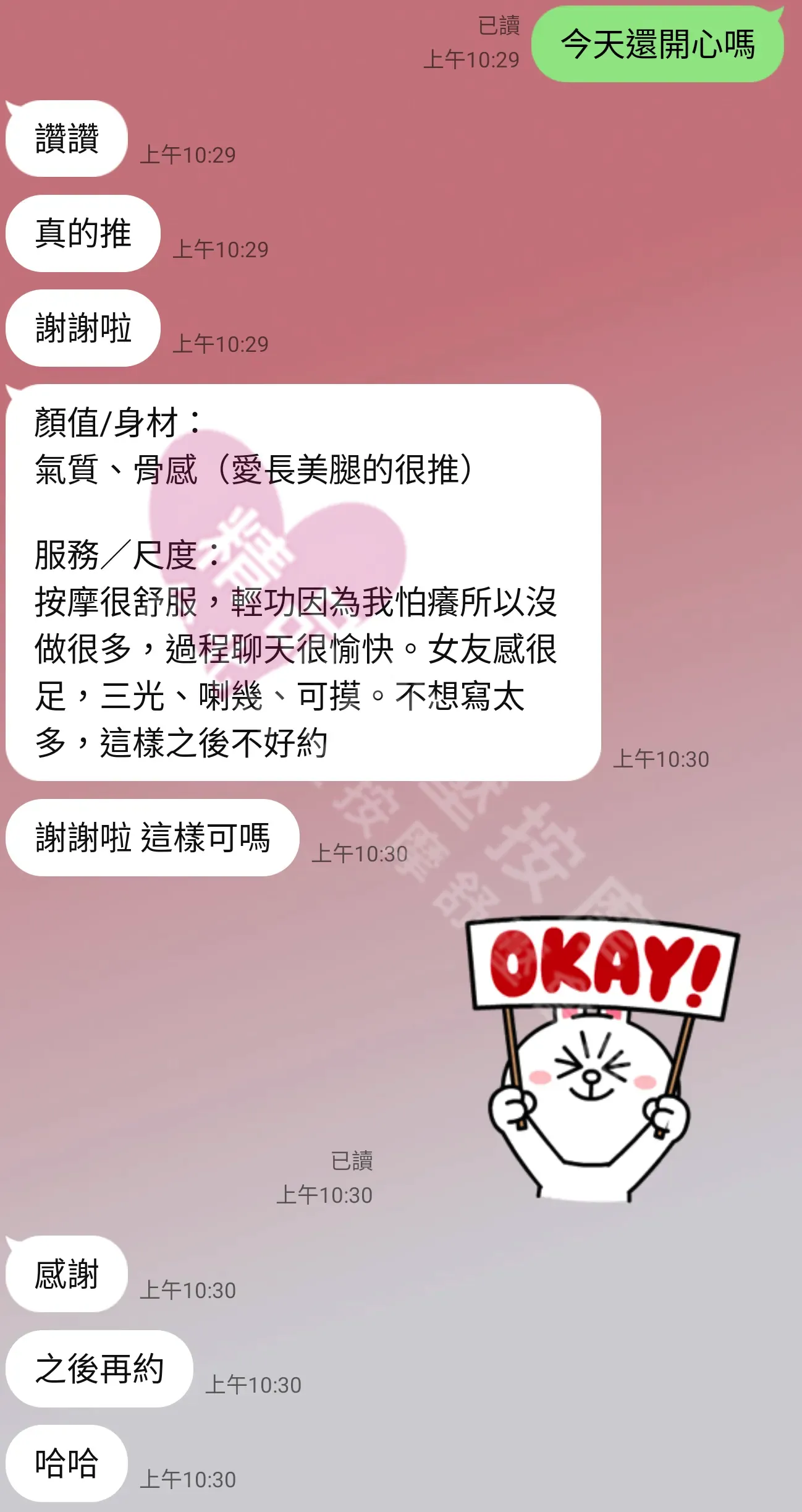 美容師都很有禮貌,先幫你背部按摩聊聊天,前戲會開始調情輕功,再來就是重點部位的加強。如果預算,也可以跟美容師聊聊加值服務,放心問都有機會。精品舒壓期待每位客人每次來舒壓都有個Happy Ending!