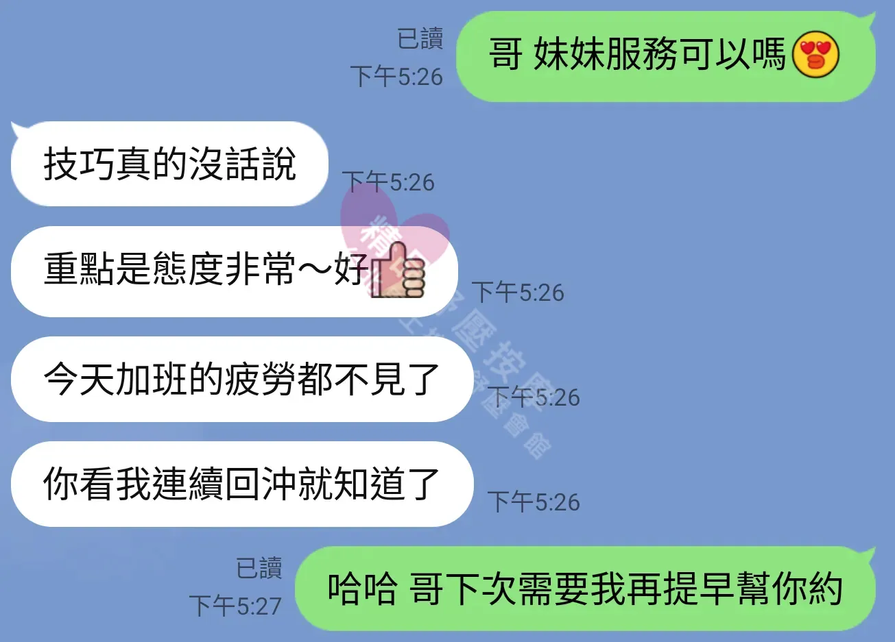 美容師都很有禮貌,先幫你背部按摩聊聊天,前戲會開始調情輕功,再來就是重點部位的加強。如果預算,也可以跟美容師聊聊加值服務,放心問都有機會。精品舒壓期待每位客人每次來舒壓都有個Happy Ending!