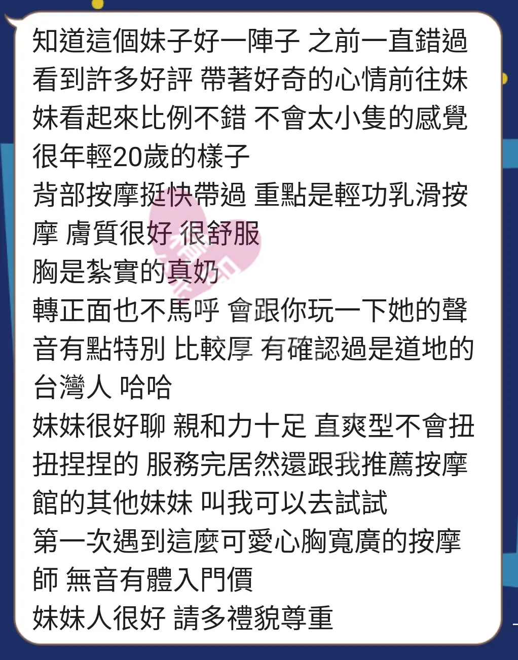 美容師都很有禮貌,先幫你背部按摩聊聊天,前戲會開始調情輕功,再來就是重點部位的加強。如果預算,也可以跟美容師聊聊加值服務,放心問都有機會。精品舒壓期待每位客人每次來舒壓都有個Happy Ending!