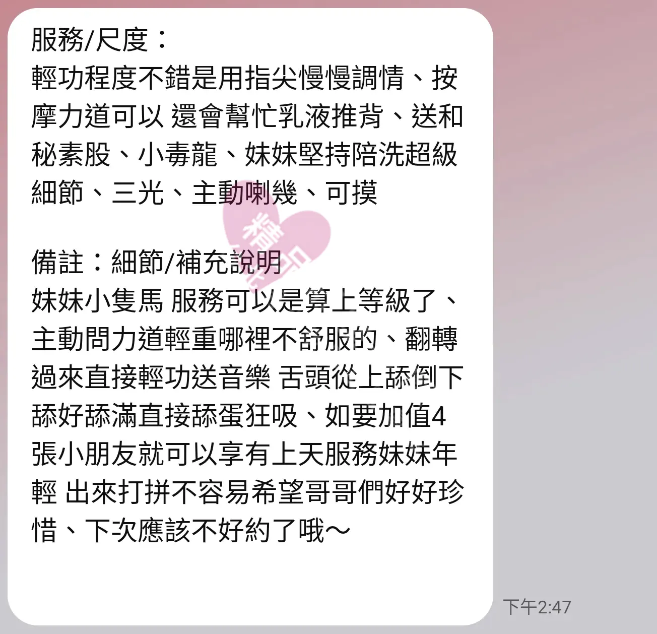 美容師都很有禮貌,先幫你背部按摩聊聊天,前戲會開始調情輕功,再來就是重點部位的加強。如果預算,也可以跟美容師聊聊加值服務,放心問都有機會。精品舒壓期待每位客人每次來舒壓都有個Happy Ending!