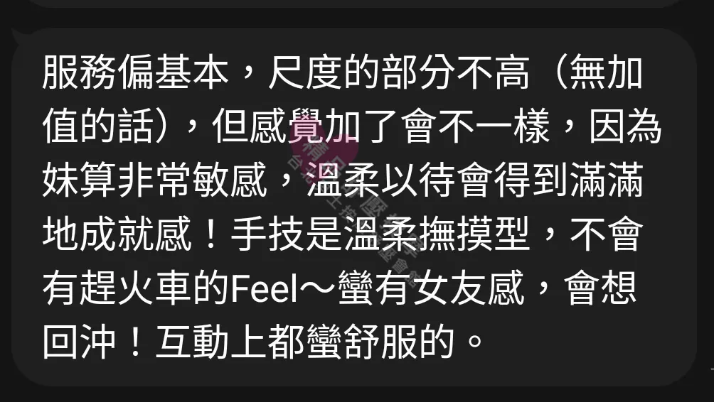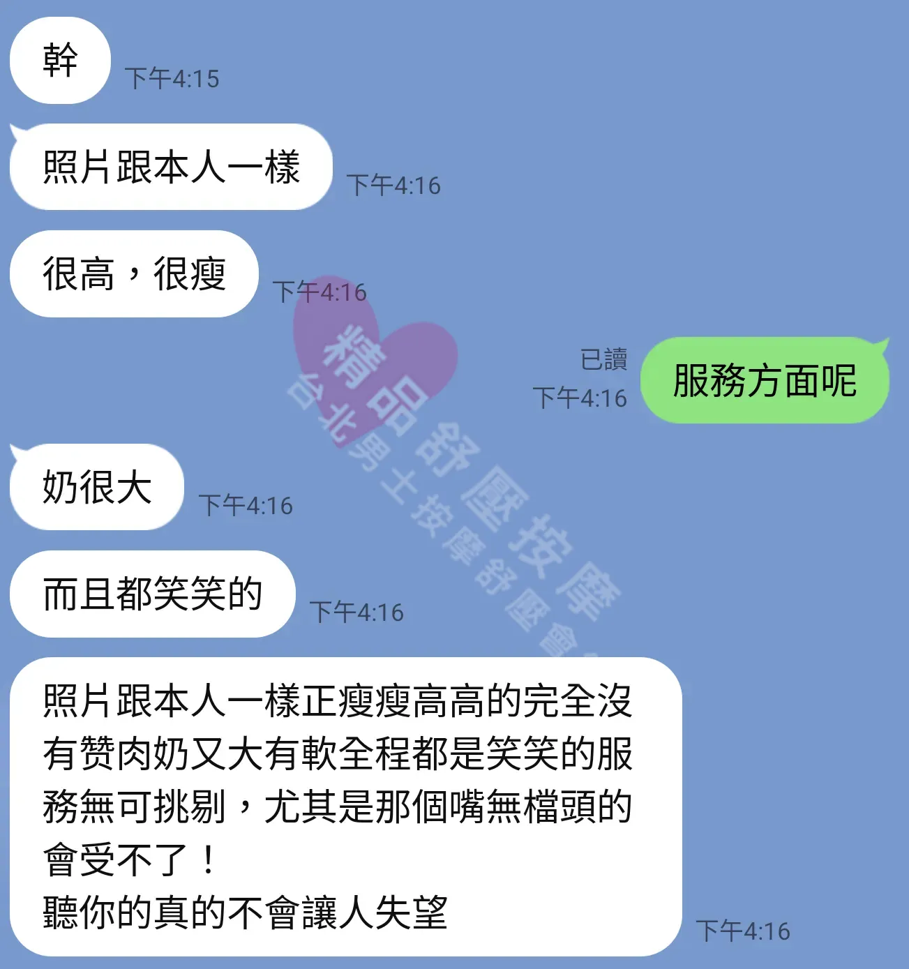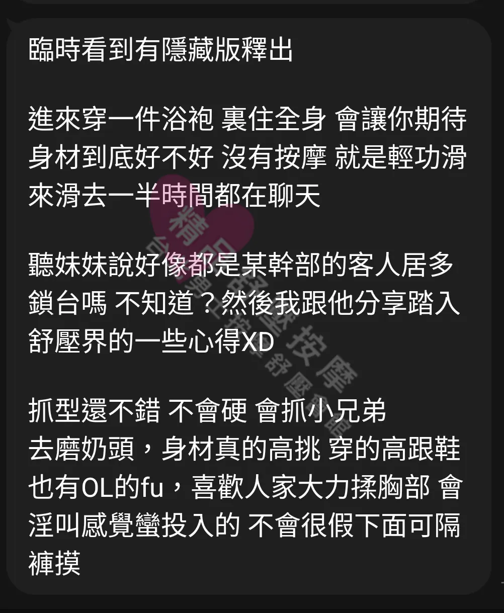 美容師都很有禮貌,先幫你背部按摩聊聊天,前戲會開始調情輕功,再來就是重點部位的加強。如果預算,也可以跟美容師聊聊加值服務,放心問都有機會。精品舒壓期待每位客人每次來舒壓都有個Happy Ending!