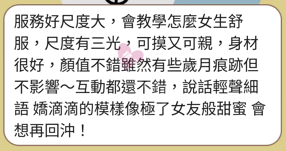 美容師都很有禮貌,先幫你背部按摩聊聊天,前戲會開始調情輕功,再來就是重點部位的加強。如果預算,也可以跟美容師聊聊加值服務,放心問都有機會。精品舒壓期待每位客人每次來舒壓都有個Happy Ending!