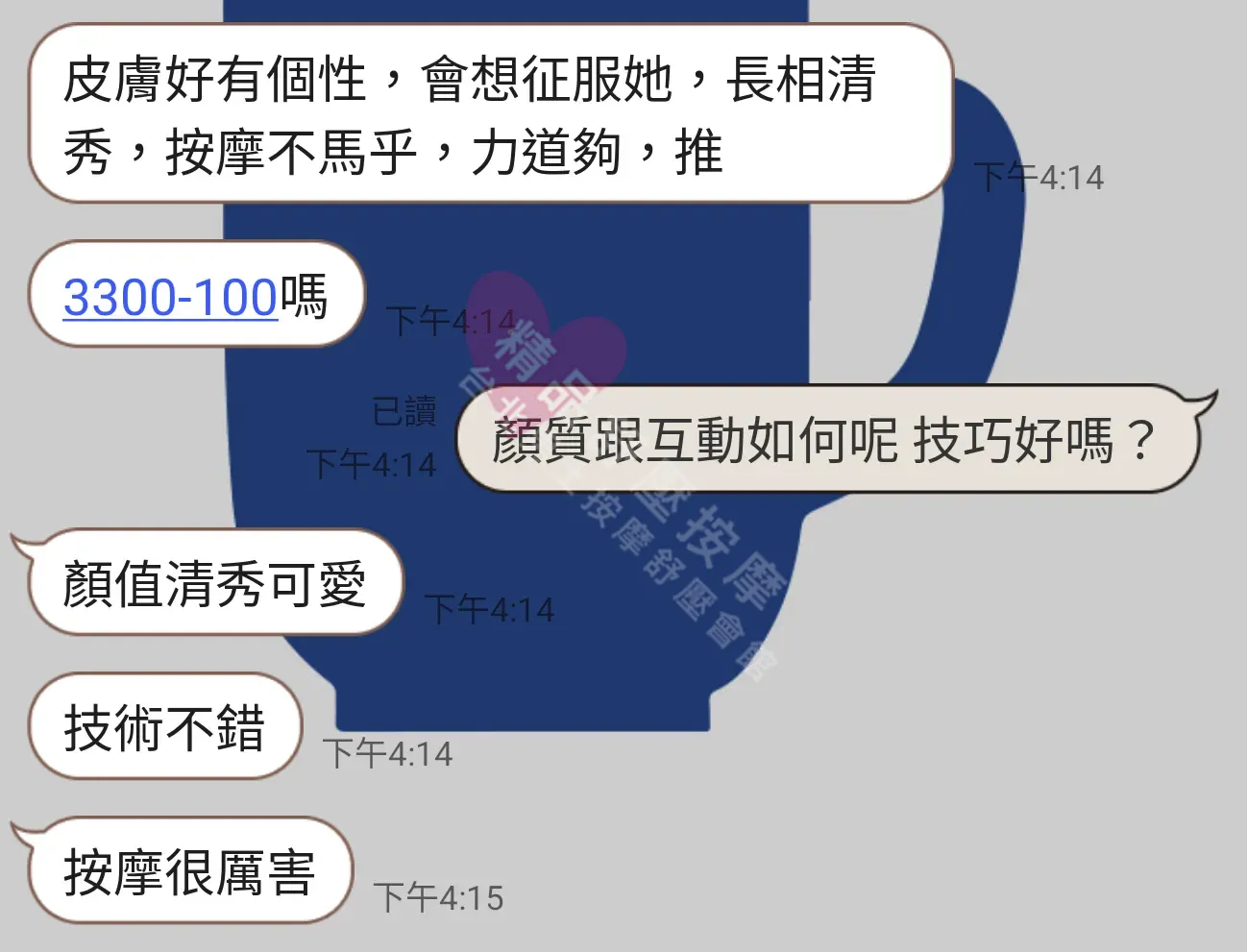 美容師都很有禮貌,先幫你背部按摩聊聊天,前戲會開始調情輕功,再來就是重點部位的加強。如果預算,也可以跟美容師聊聊加值服務,放心問都有機會。精品舒壓期待每位客人每次來舒壓都有個Happy Ending!