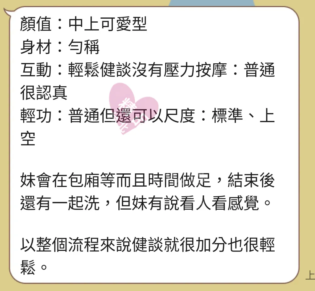 美容師都很有禮貌,先幫你背部按摩聊聊天,前戲會開始調情輕功,再來就是重點部位的加強。如果預算,也可以跟美容師聊聊加值服務,放心問都有機會。精品舒壓期待每位客人每次來舒壓都有個Happy Ending!