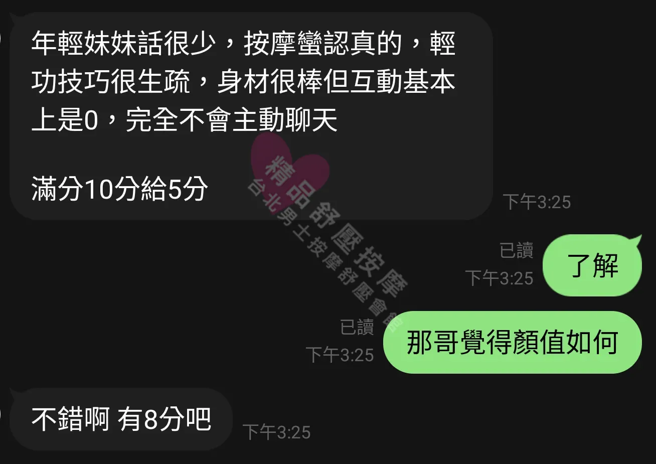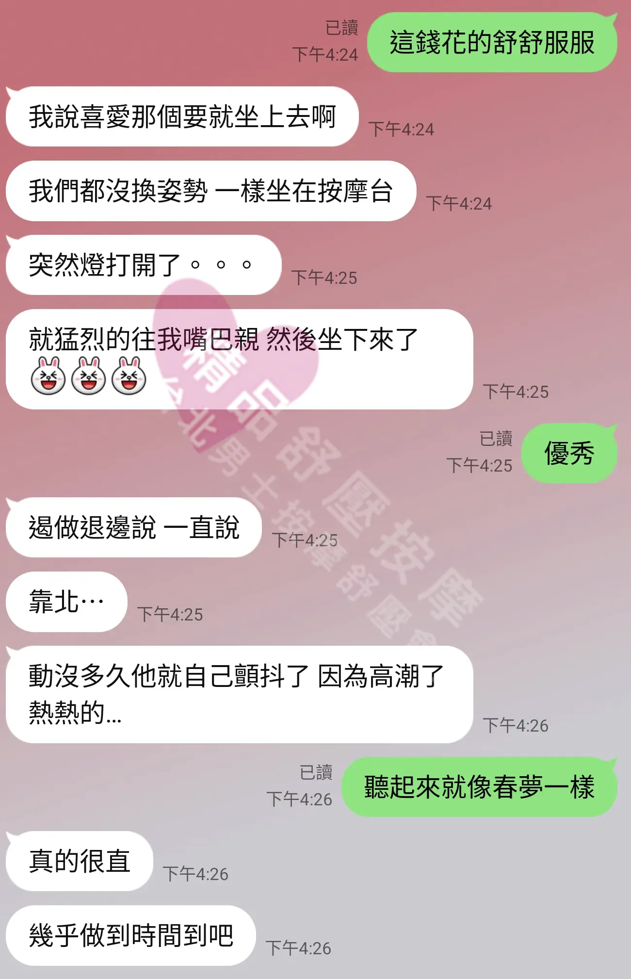 美容師都很有禮貌,先幫你背部按摩聊聊天,前戲會開始調情輕功,再來就是重點部位的加強。如果預算,也可以跟美容師聊聊加值服務,放心問都有機會。精品舒壓期待每位客人每次來舒壓都有個Happy Ending!