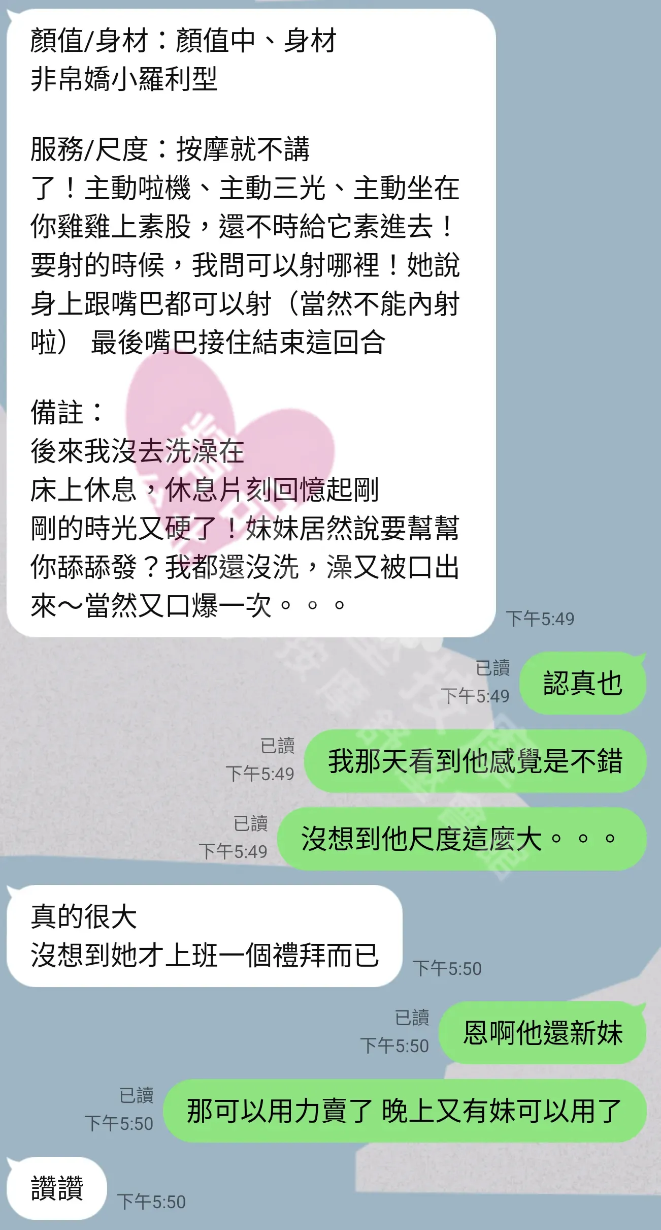 美容師都很有禮貌,先幫你背部按摩聊聊天,前戲會開始調情輕功,再來就是重點部位的加強。如果預算,也可以跟美容師聊聊加值服務,放心問都有機會。精品舒壓期待每位客人每次來舒壓都有個Happy Ending!