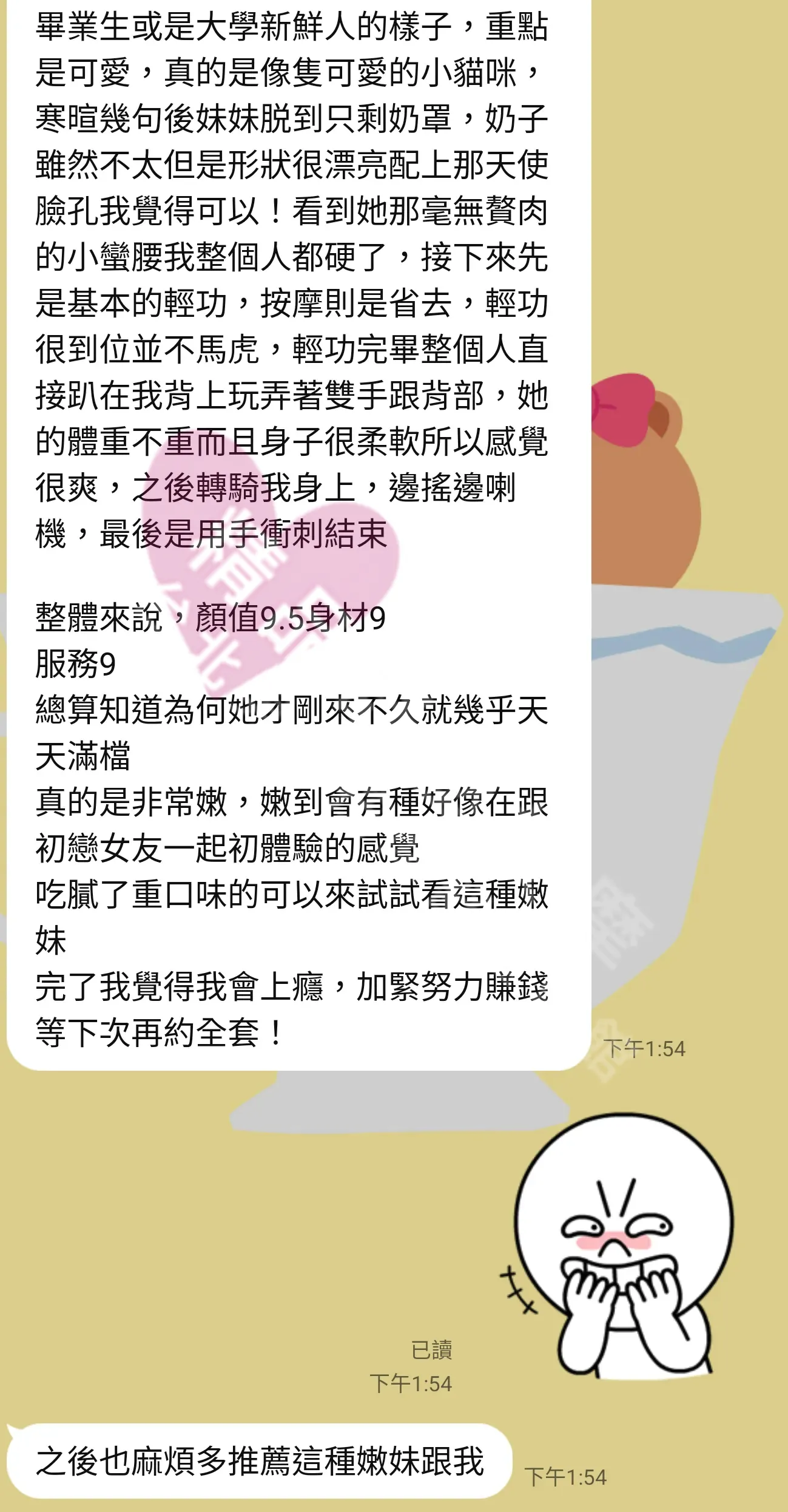 美容師都很有禮貌,先幫你背部按摩聊聊天,前戲會開始調情輕功,再來就是重點部位的加強。如果預算,也可以跟美容師聊聊加值服務,放心問都有機會。精品舒壓期待每位客人每次來舒壓都有個Happy Ending!