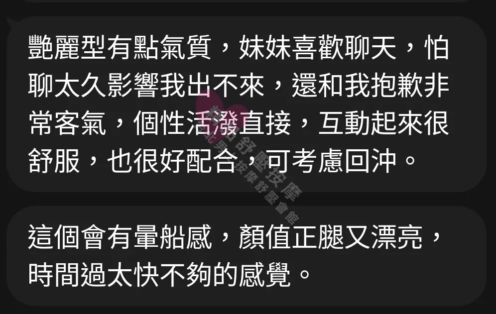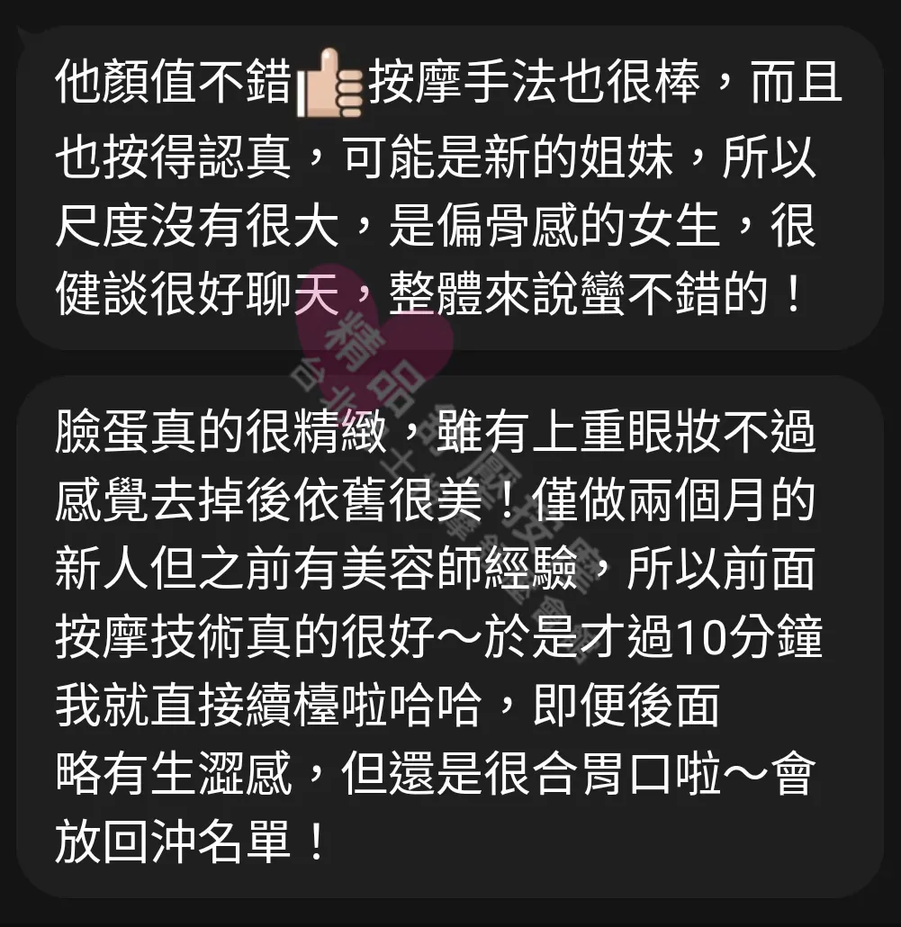 美容師都很有禮貌,先幫你背部按摩聊聊天,前戲會開始調情輕功,再來就是重點部位的加強。如果預算,也可以跟美容師聊聊加值服務,放心問都有機會。精品舒壓期待每位客人每次來舒壓都有個Happy Ending!