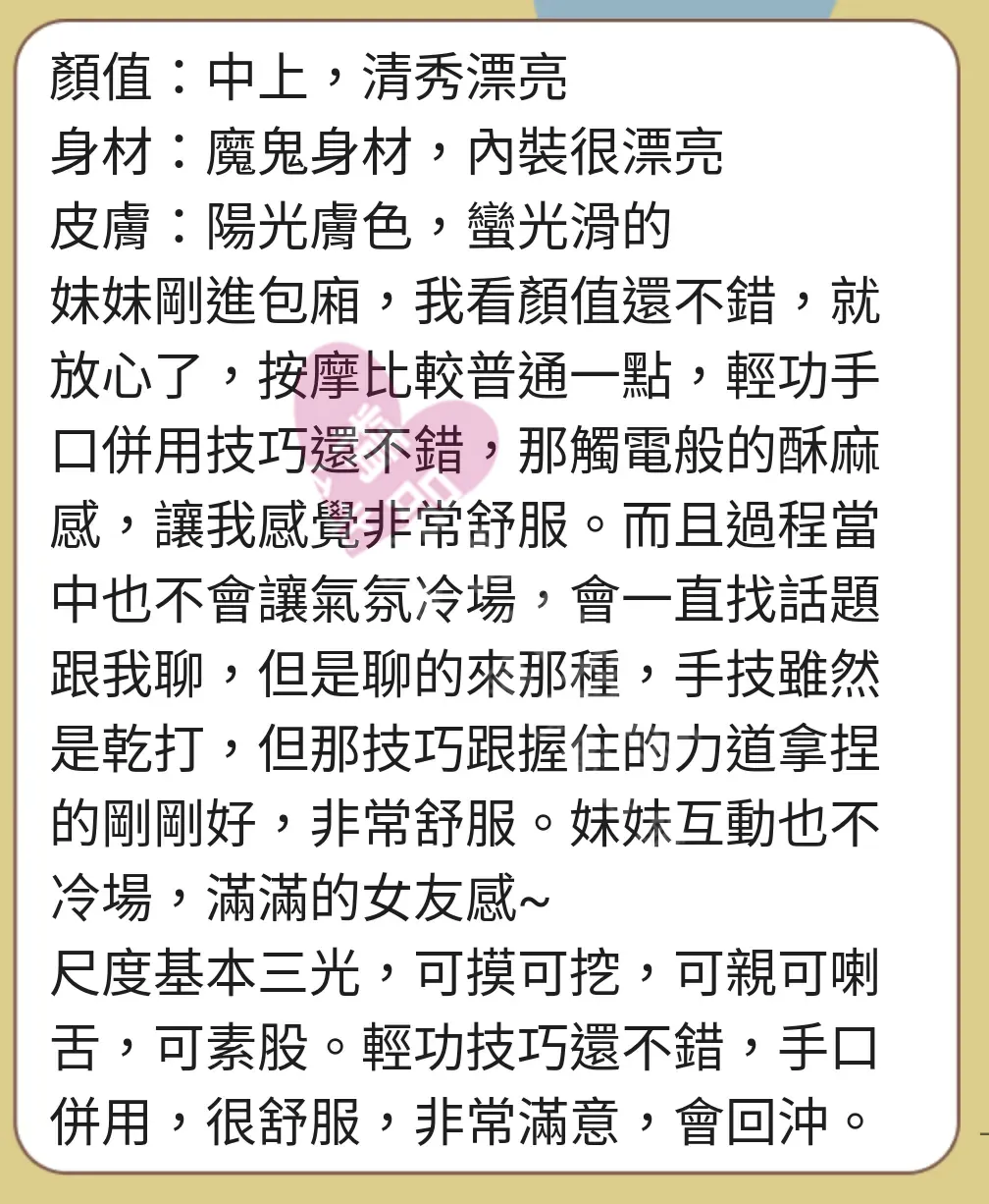 美容師都很有禮貌,先幫你背部按摩聊聊天,前戲會開始調情輕功,再來就是重點部位的加強。如果預算,也可以跟美容師聊聊加值服務,放心問都有機會。精品舒壓期待每位客人每次來舒壓都有個Happy Ending!