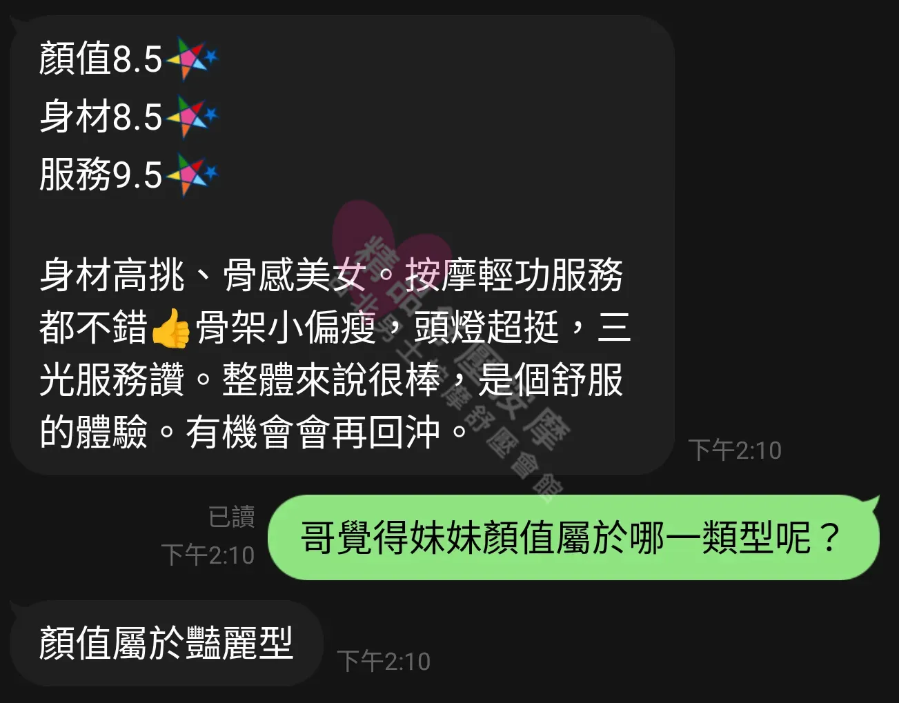 美容師都很有禮貌,先幫你背部按摩聊聊天,前戲會開始調情輕功,再來就是重點部位的加強。如果預算,也可以跟美容師聊聊加值服務,放心問都有機會。精品舒壓期待每位客人每次來舒壓都有個Happy Ending!