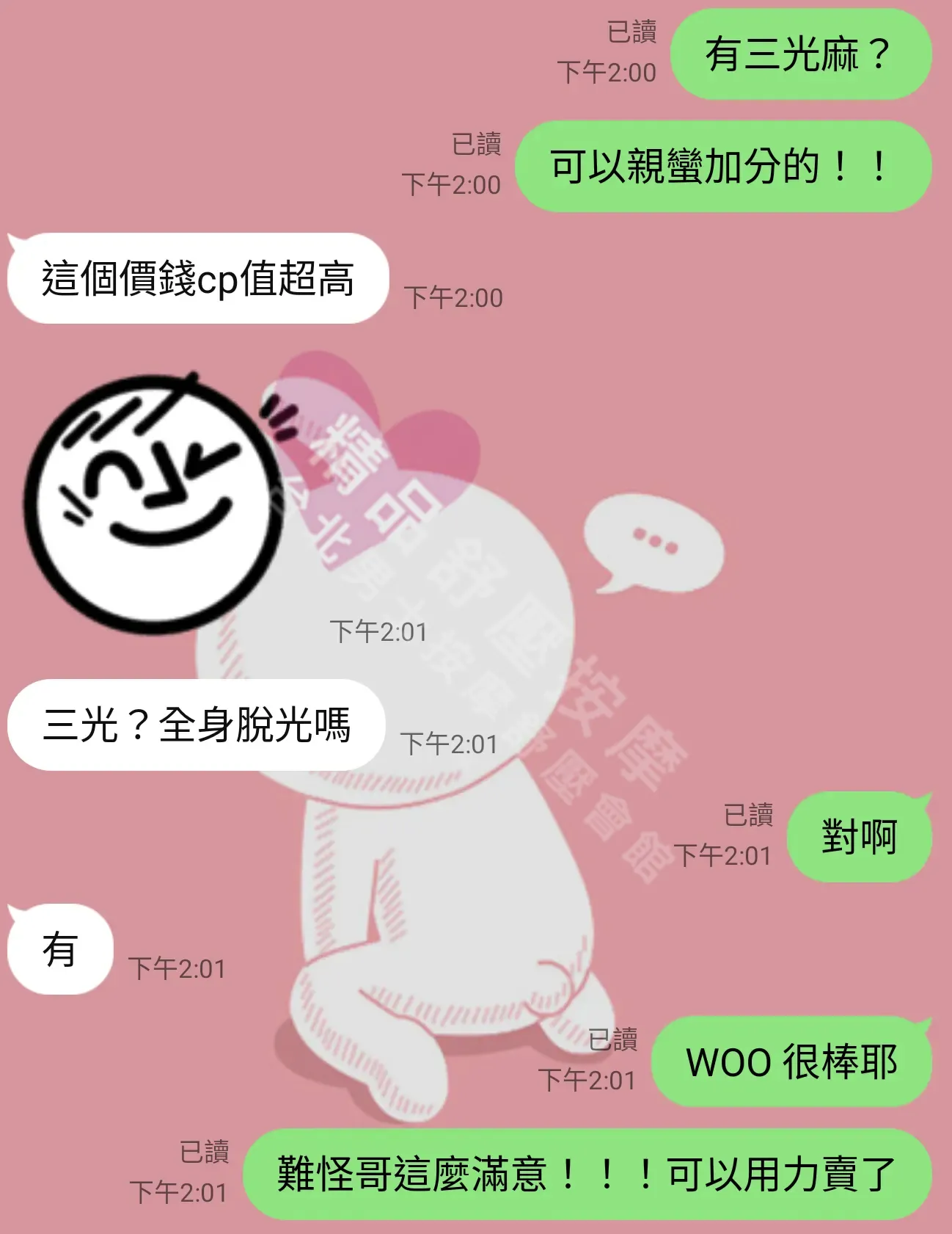 美容師都很有禮貌,先幫你背部按摩聊聊天,前戲會開始調情輕功,再來就是重點部位的加強。如果預算,也可以跟美容師聊聊加值服務,放心問都有機會。精品舒壓期待每位客人每次來舒壓都有個Happy Ending!