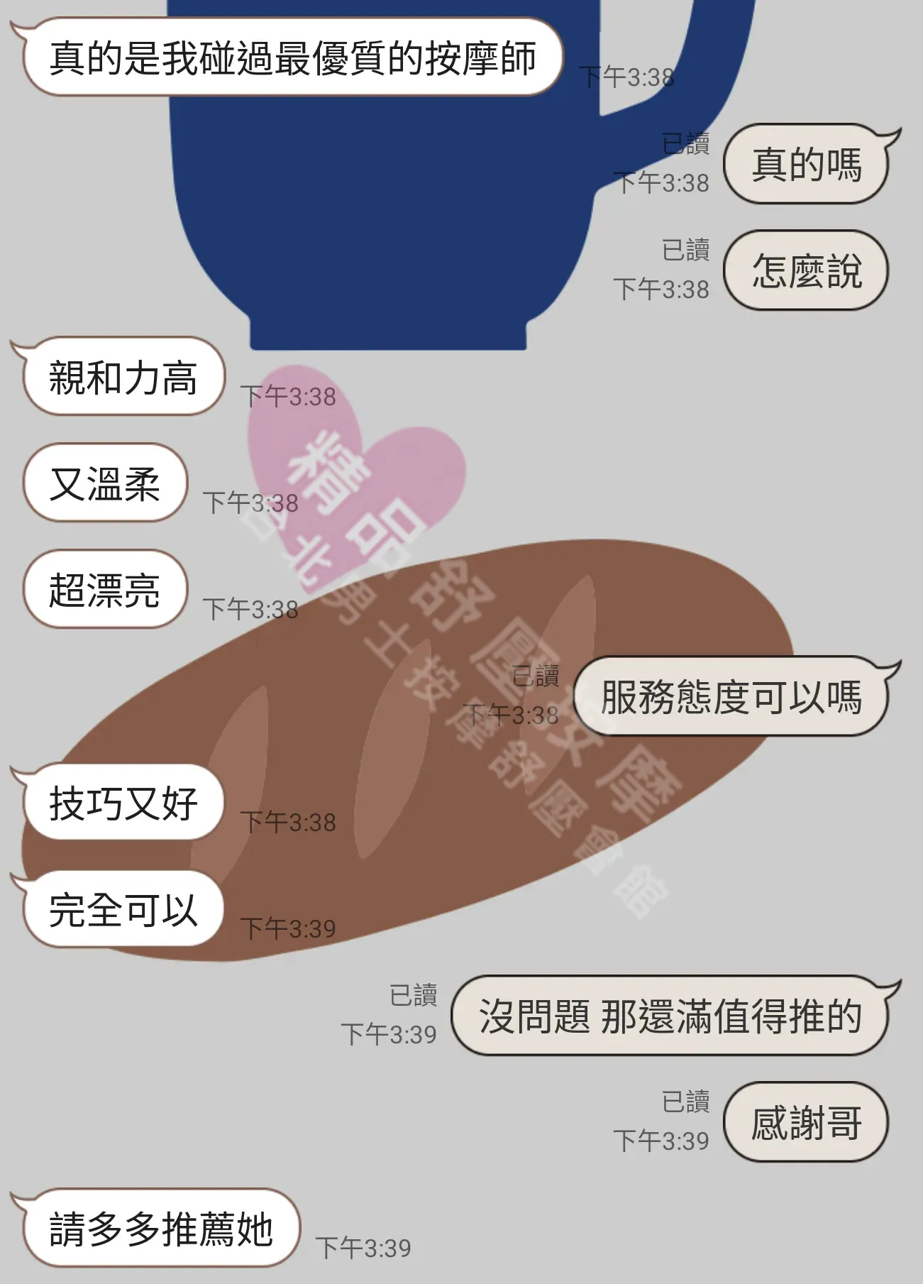 美容師都很有禮貌,先幫你背部按摩聊聊天,前戲會開始調情輕功,再來就是重點部位的加強。如果預算,也可以跟美容師聊聊加值服務,放心問都有機會。精品舒壓期待每位客人每次來舒壓都有個Happy Ending!