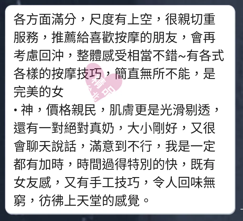 美容師都很有禮貌,先幫你背部按摩聊聊天,前戲會開始調情輕功,再來就是重點部位的加強。如果預算,也可以跟美容師聊聊加值服務,放心問都有機會。精品舒壓期待每位客人每次來舒壓都有個Happy Ending!