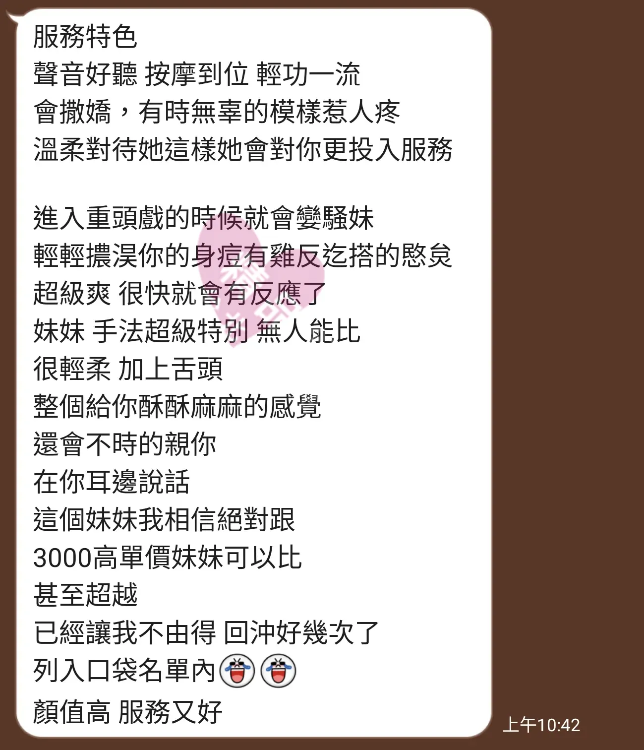 美容師都很有禮貌,先幫你背部按摩聊聊天,前戲會開始調情輕功,再來就是重點部位的加強。如果預算,也可以跟美容師聊聊加值服務,放心問都有機會。精品舒壓期待每位客人每次來舒壓都有個Happy Ending!