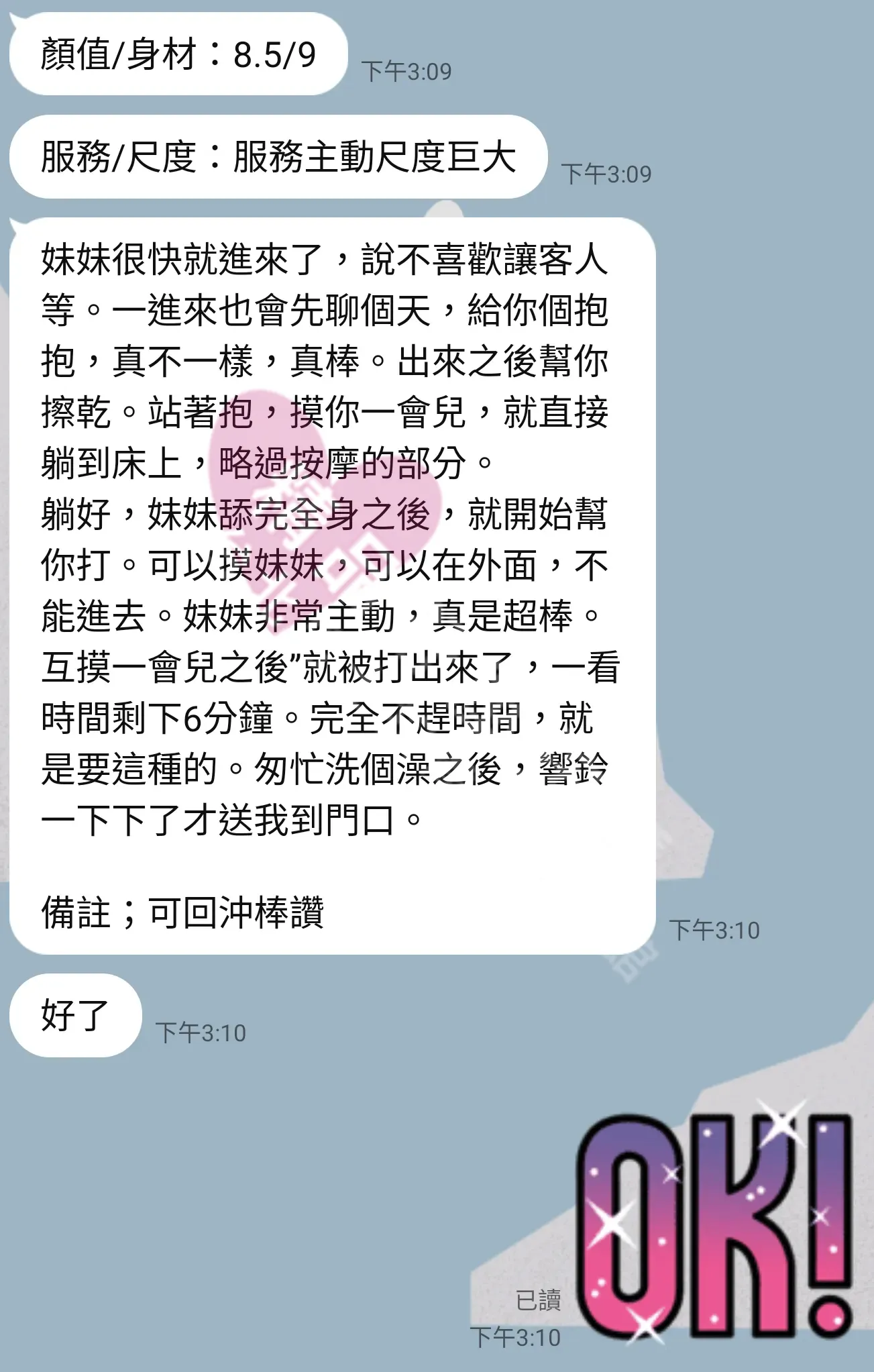 美容師都很有禮貌,先幫你背部按摩聊聊天,前戲會開始調情輕功,再來就是重點部位的加強。如果預算,也可以跟美容師聊聊加值服務,放心問都有機會。精品舒壓期待每位客人每次來舒壓都有個Happy Ending!