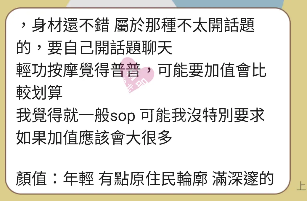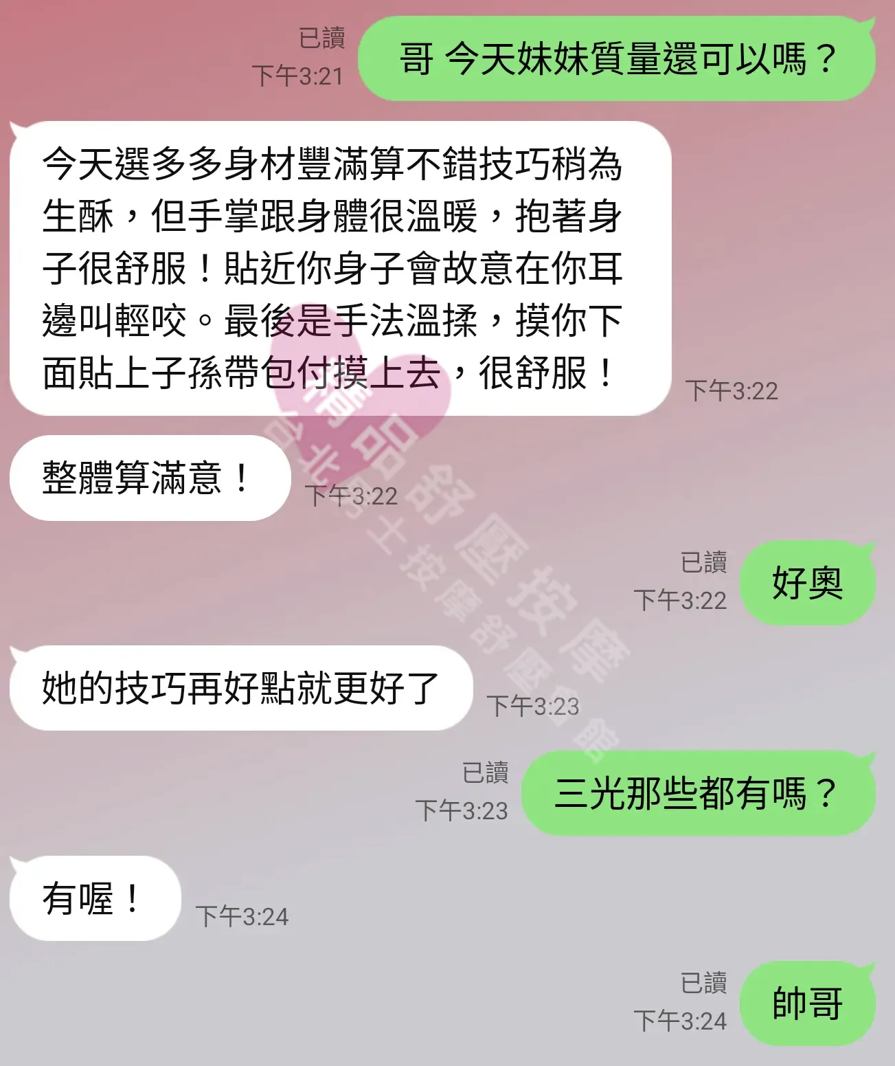 美容師都很有禮貌,先幫你背部按摩聊聊天,前戲會開始調情輕功,再來就是重點部位的加強。如果預算,也可以跟美容師聊聊加值服務,放心問都有機會。精品舒壓期待每位客人每次來舒壓都有個Happy Ending!