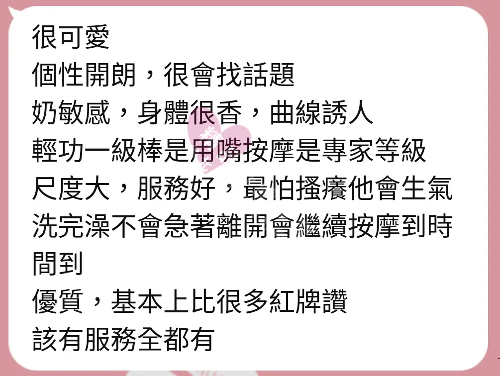 美容師都很有禮貌,先幫你背部按摩聊聊天,前戲會開始調情輕功,再來就是重點部位的加強。如果預算,也可以跟美容師聊聊加值服務,放心問都有機會。精品舒壓期待每位客人每次來舒壓都有個Happy Ending!