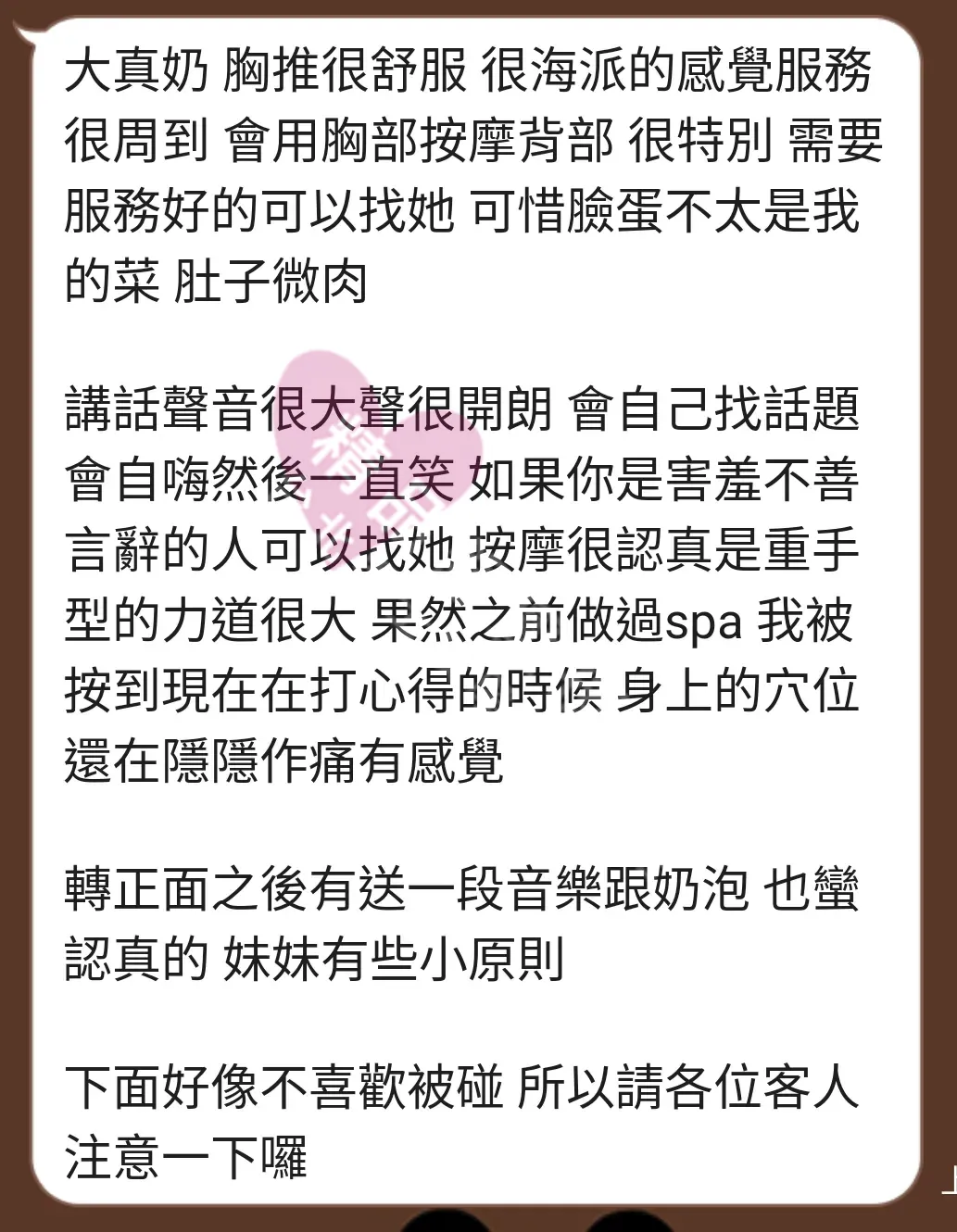 美容師都很有禮貌,先幫你背部按摩聊聊天,前戲會開始調情輕功,再來就是重點部位的加強。如果預算,也可以跟美容師聊聊加值服務,放心問都有機會。精品舒壓期待每位客人每次來舒壓都有個Happy Ending!