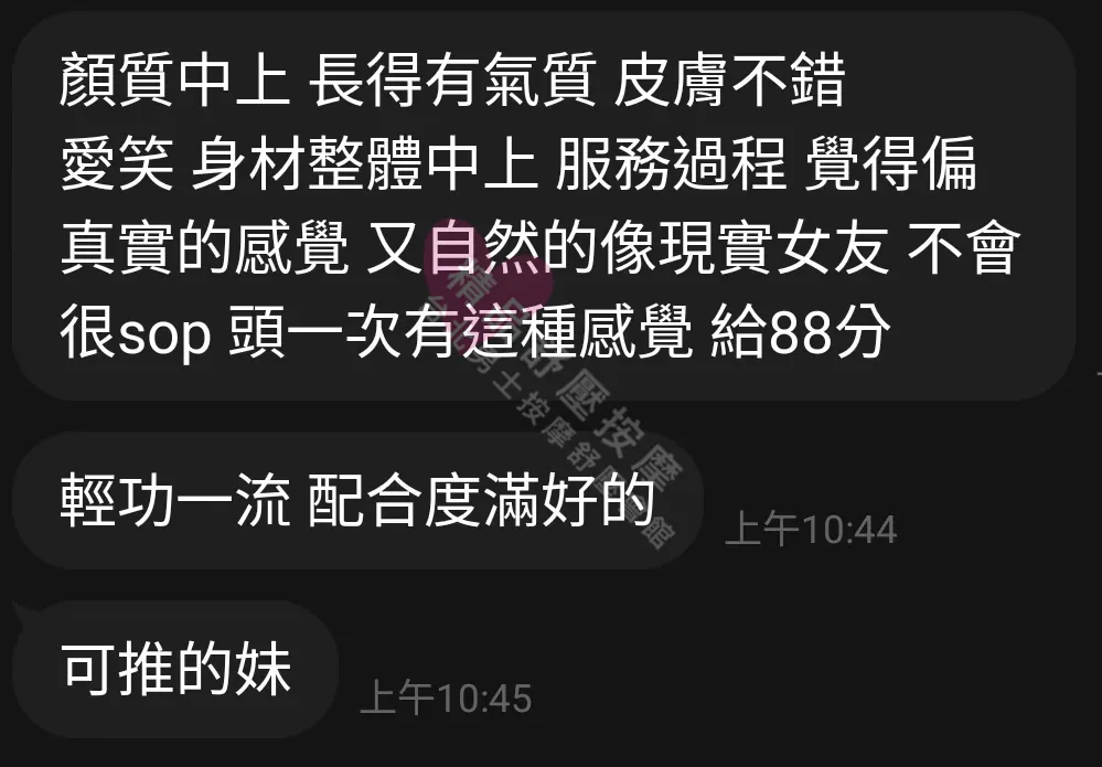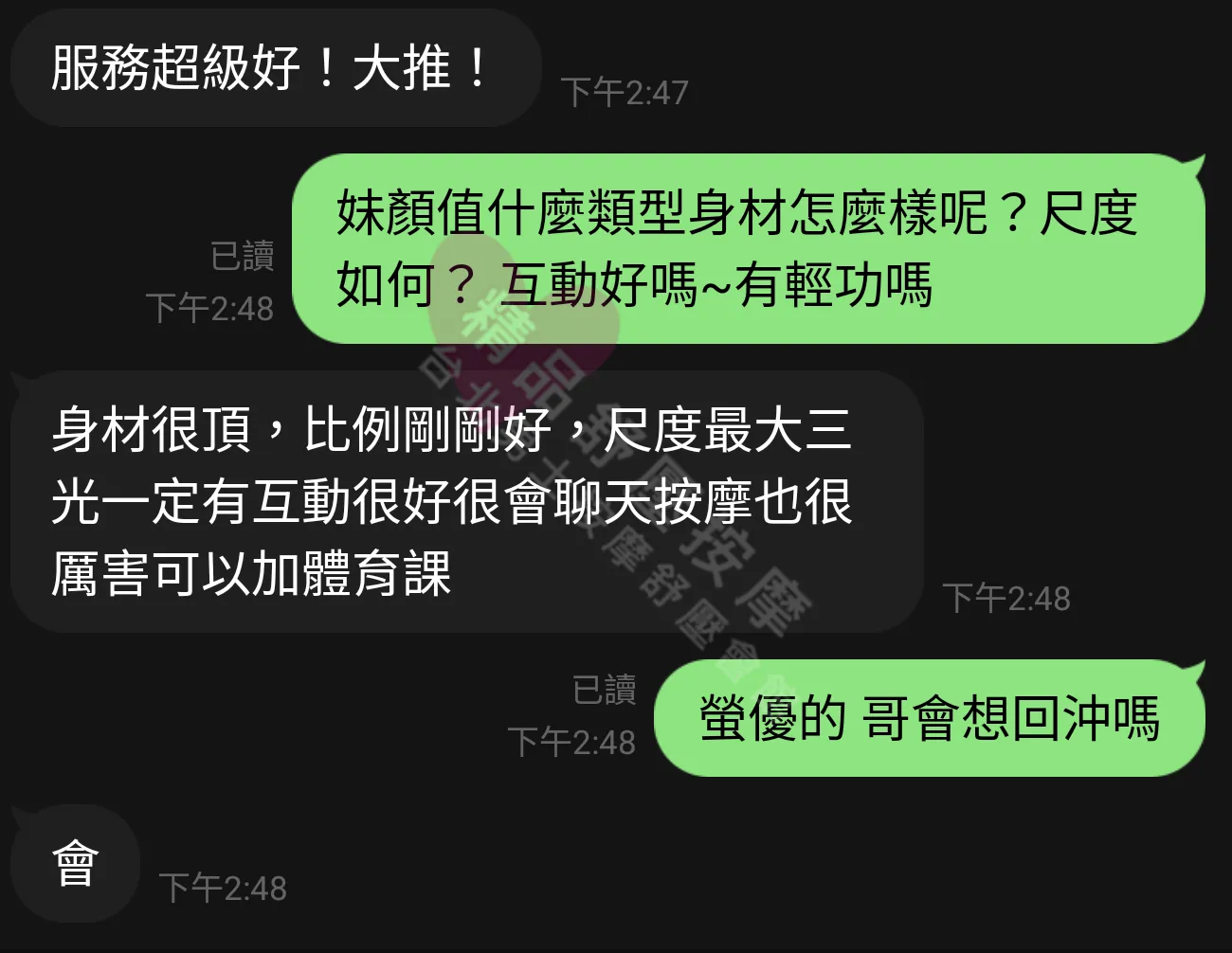 美容師都很有禮貌,先幫你背部按摩聊聊天,前戲會開始調情輕功,再來就是重點部位的加強。如果預算,也可以跟美容師聊聊加值服務,放心問都有機會。精品舒壓期待每位客人每次來舒壓都有個Happy Ending!