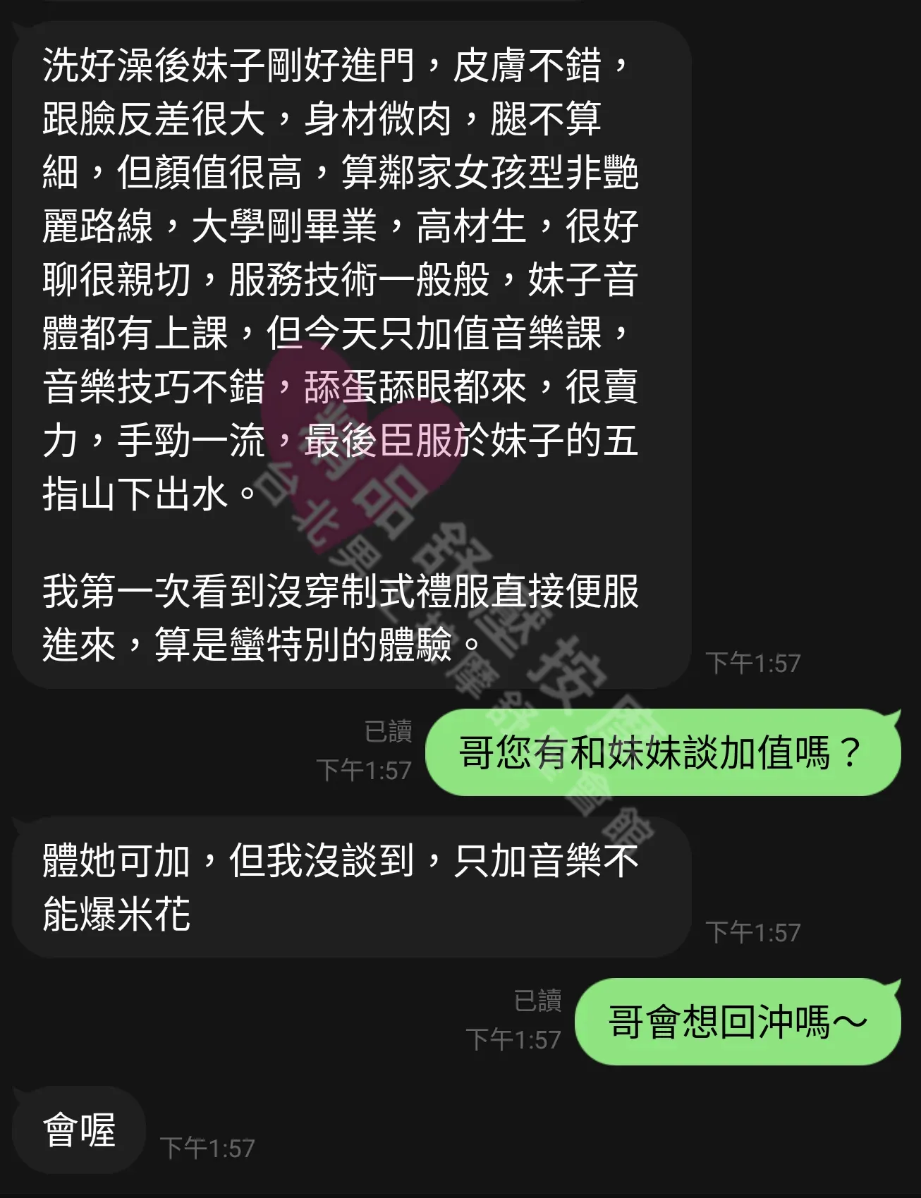 美容師都很有禮貌,先幫你背部按摩聊聊天,前戲會開始調情輕功,再來就是重點部位的加強。如果預算,也可以跟美容師聊聊加值服務,放心問都有機會。精品舒壓期待每位客人每次來舒壓都有個Happy Ending!