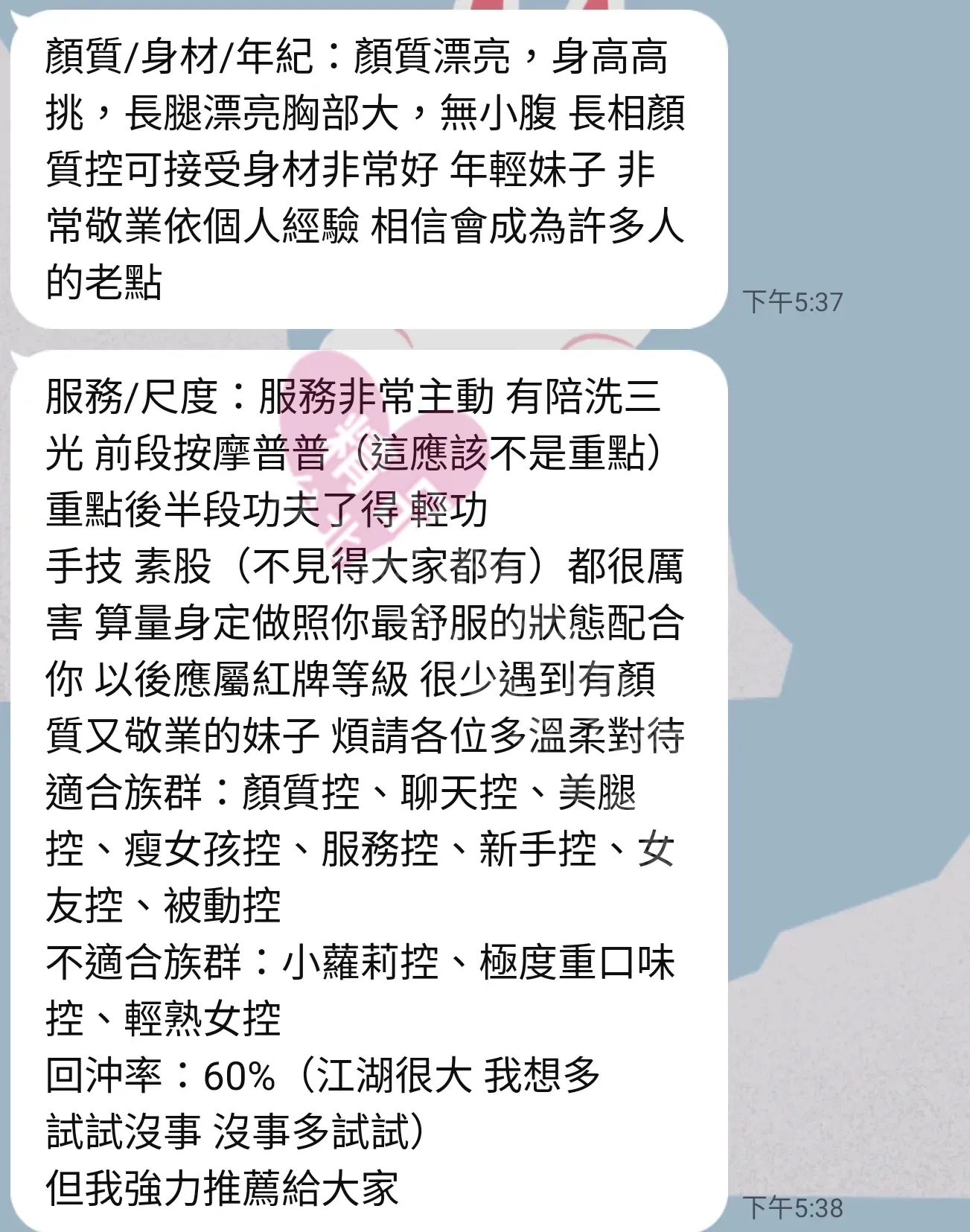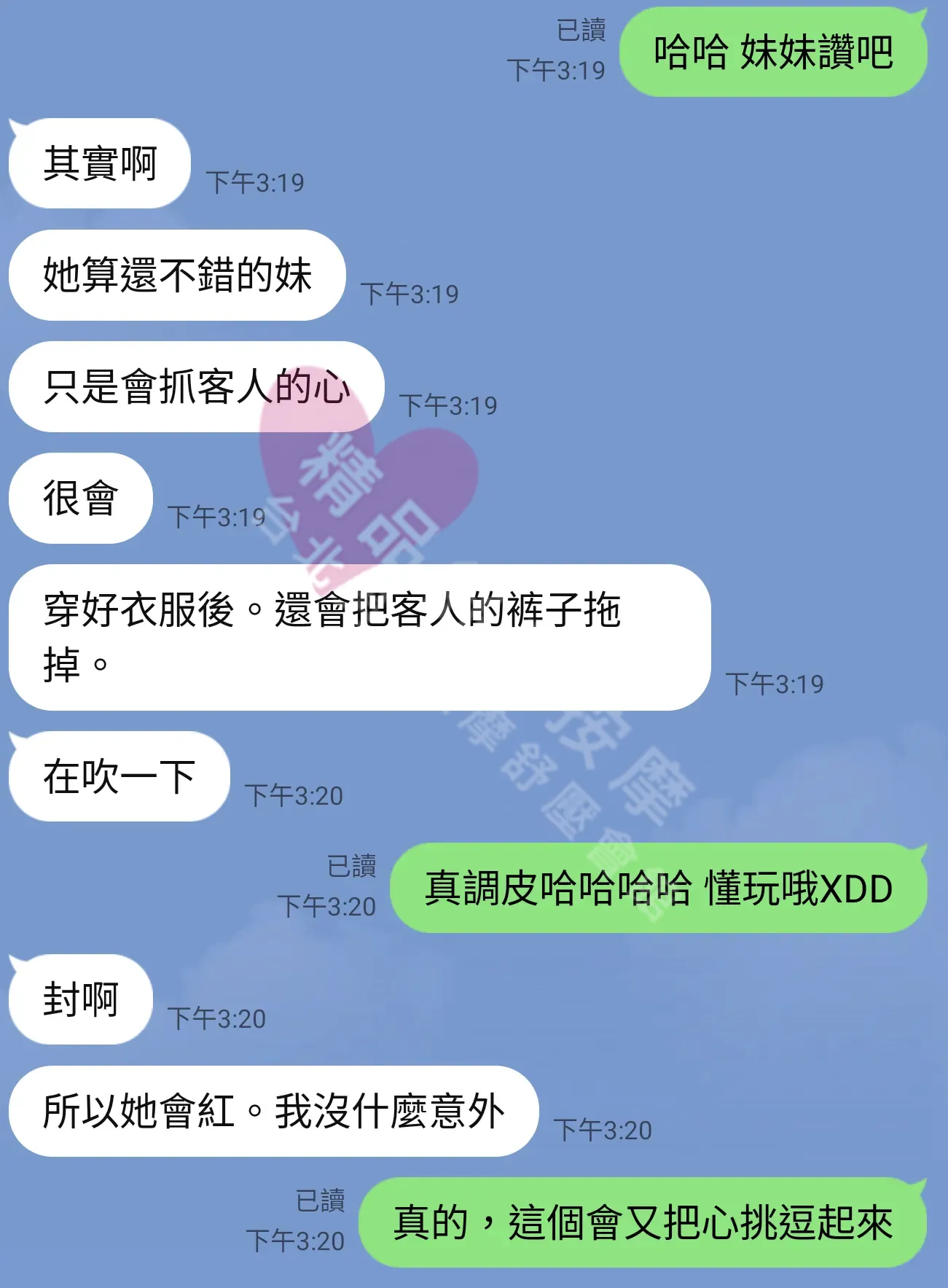美容師都很有禮貌,先幫你背部按摩聊聊天,前戲會開始調情輕功,再來就是重點部位的加強。如果預算,也可以跟美容師聊聊加值服務,放心問都有機會。精品舒壓期待每位客人每次來舒壓都有個Happy Ending!