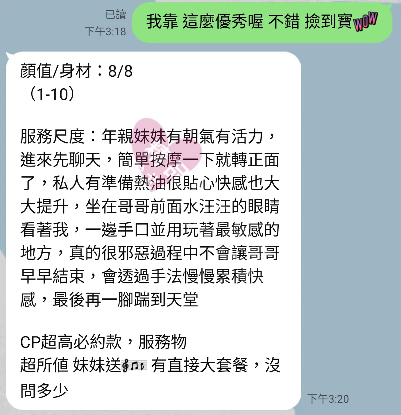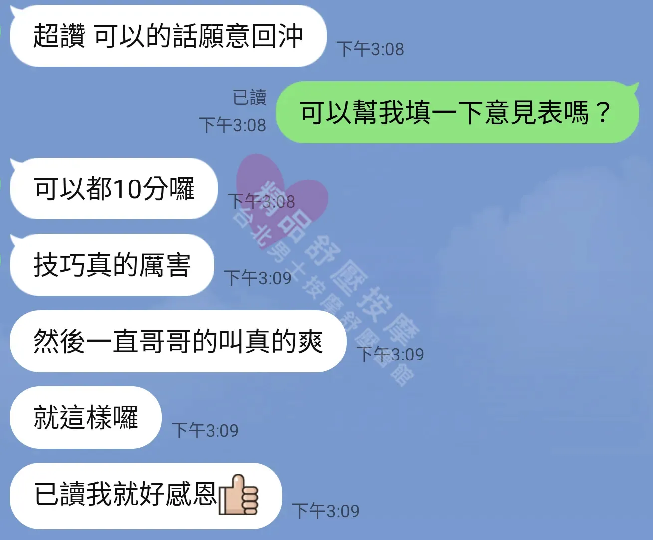 美容師都很有禮貌,先幫你背部按摩聊聊天,前戲會開始調情輕功,再來就是重點部位的加強。如果預算,也可以跟美容師聊聊加值服務,放心問都有機會。精品舒壓期待每位客人每次來舒壓都有個Happy Ending!