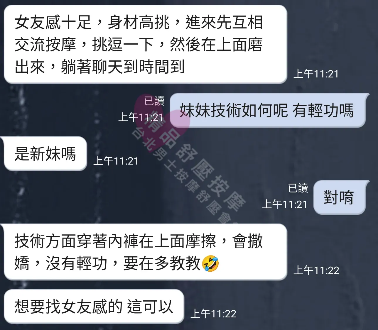 美容師都很有禮貌,先幫你背部按摩聊聊天,前戲會開始調情輕功,再來就是重點部位的加強。如果預算,也可以跟美容師聊聊加值服務,放心問都有機會。精品舒壓期待每位客人每次來舒壓都有個Happy Ending!