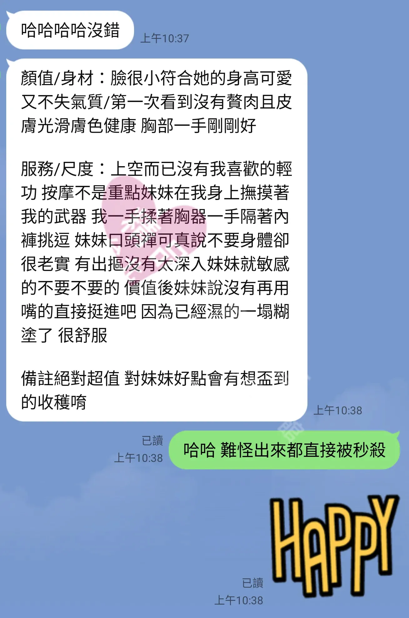 美容師都很有禮貌,先幫你背部按摩聊聊天,前戲會開始調情輕功,再來就是重點部位的加強。如果預算,也可以跟美容師聊聊加值服務,放心問都有機會。精品舒壓期待每位客人每次來舒壓都有個Happy Ending!