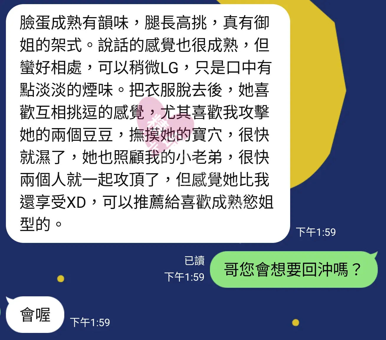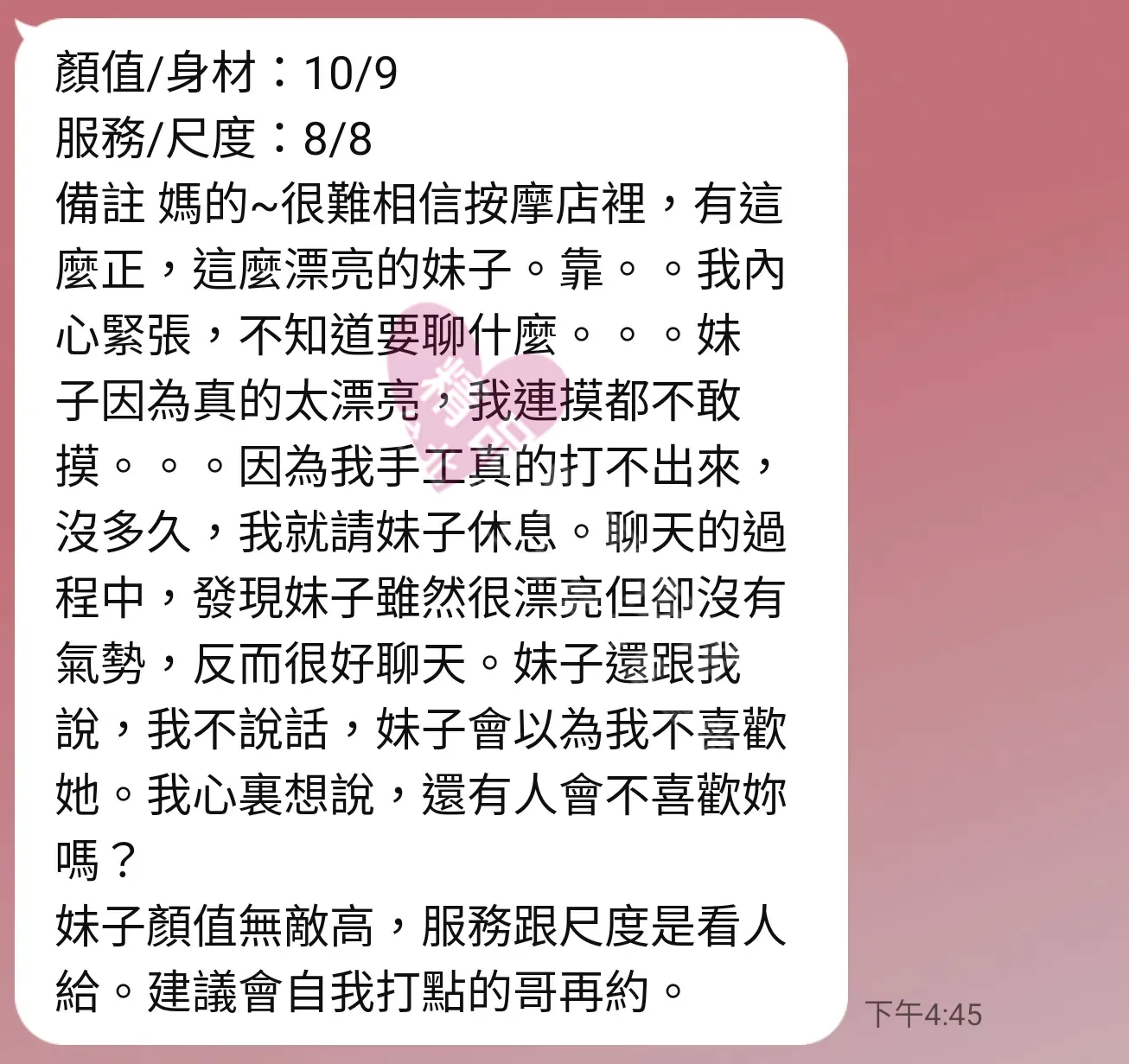 美容師都很有禮貌,先幫你背部按摩聊聊天,前戲會開始調情輕功,再來就是重點部位的加強。如果預算,也可以跟美容師聊聊加值服務,放心問都有機會。精品舒壓期待每位客人每次來舒壓都有個Happy Ending!