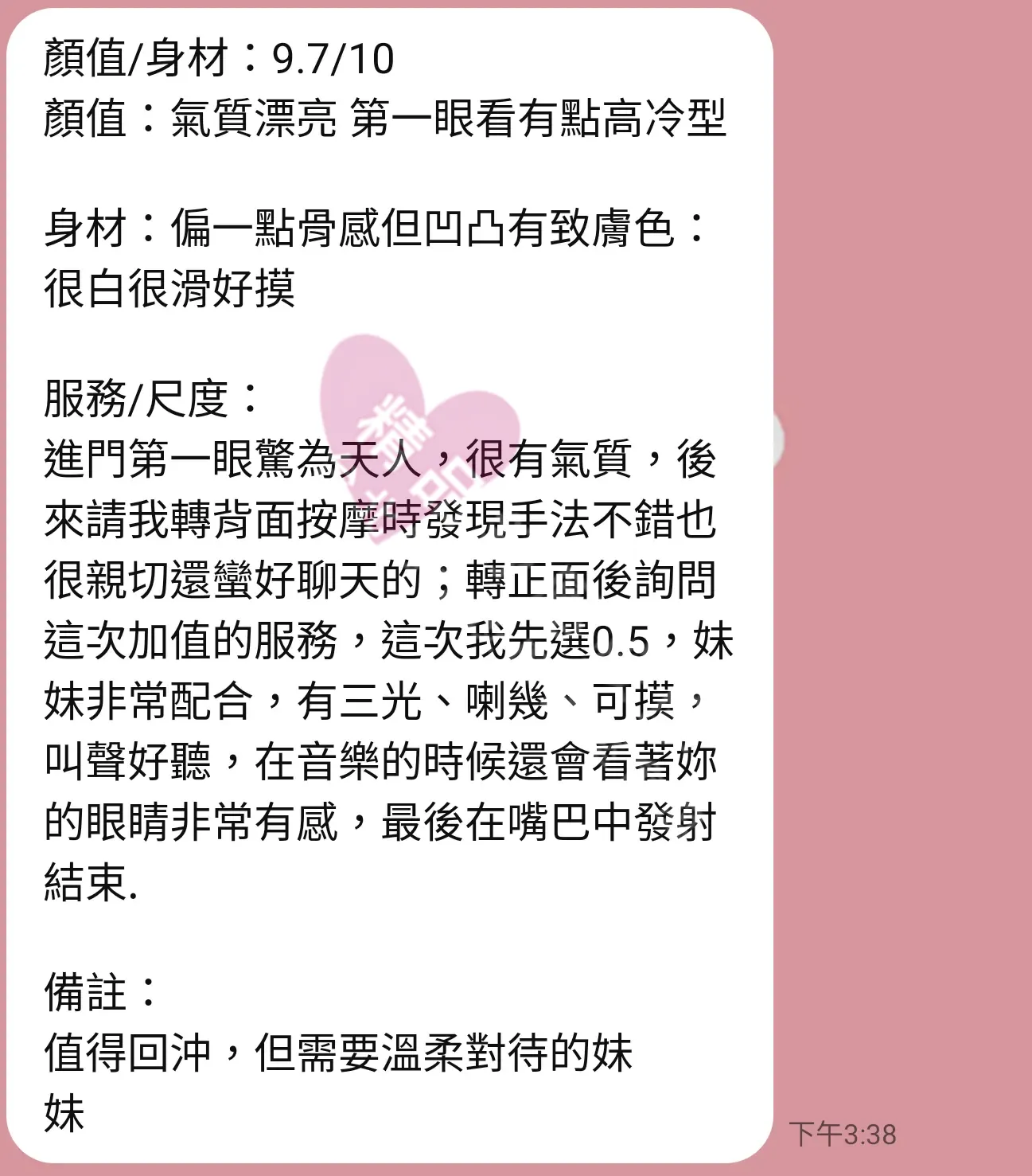美容師都很有禮貌,先幫你背部按摩聊聊天,前戲會開始調情輕功,再來就是重點部位的加強。如果預算,也可以跟美容師聊聊加值服務,放心問都有機會。精品舒壓期待每位客人每次來舒壓都有個Happy Ending!