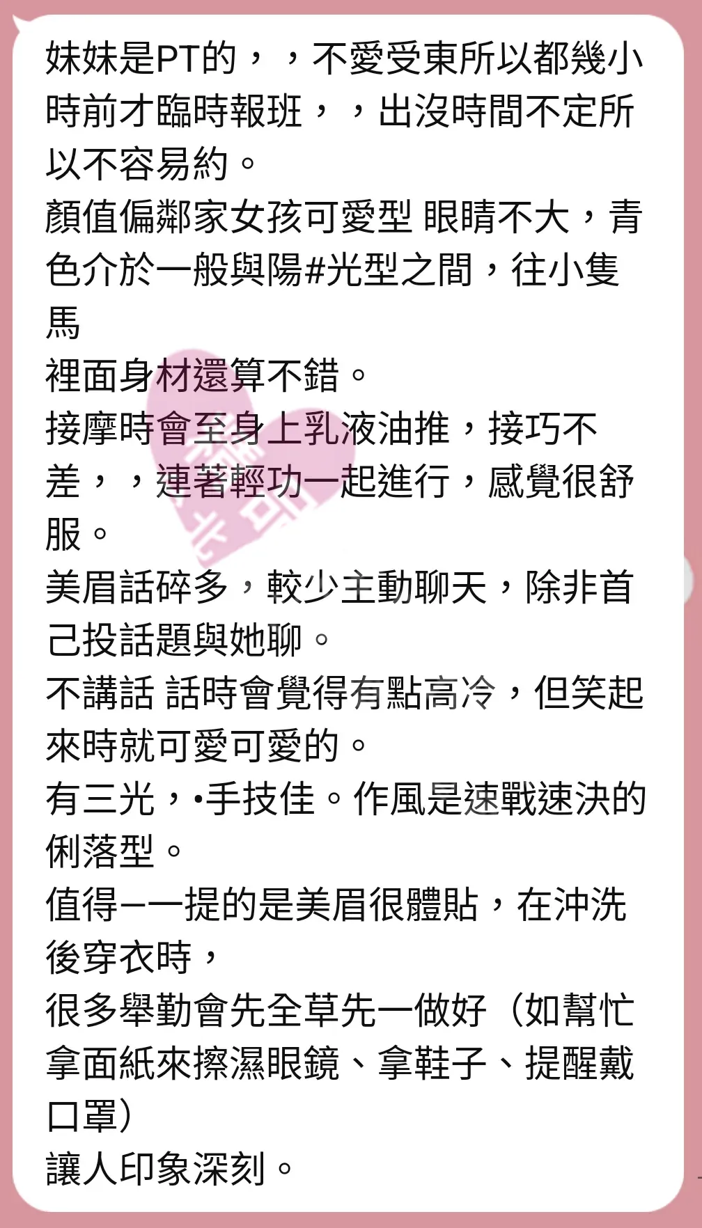 美容師都很有禮貌,先幫你背部按摩聊聊天,前戲會開始調情輕功,再來就是重點部位的加強。如果預算,也可以跟美容師聊聊加值服務,放心問都有機會。精品舒壓期待每位客人每次來舒壓都有個Happy Ending!