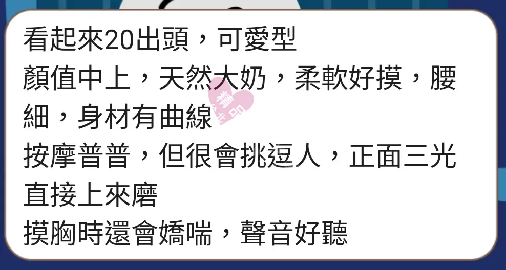 美容師都很有禮貌,先幫你背部按摩聊聊天,前戲會開始調情輕功,再來就是重點部位的加強。如果預算,也可以跟美容師聊聊加值服務,放心問都有機會。精品舒壓期待每位客人每次來舒壓都有個Happy Ending!