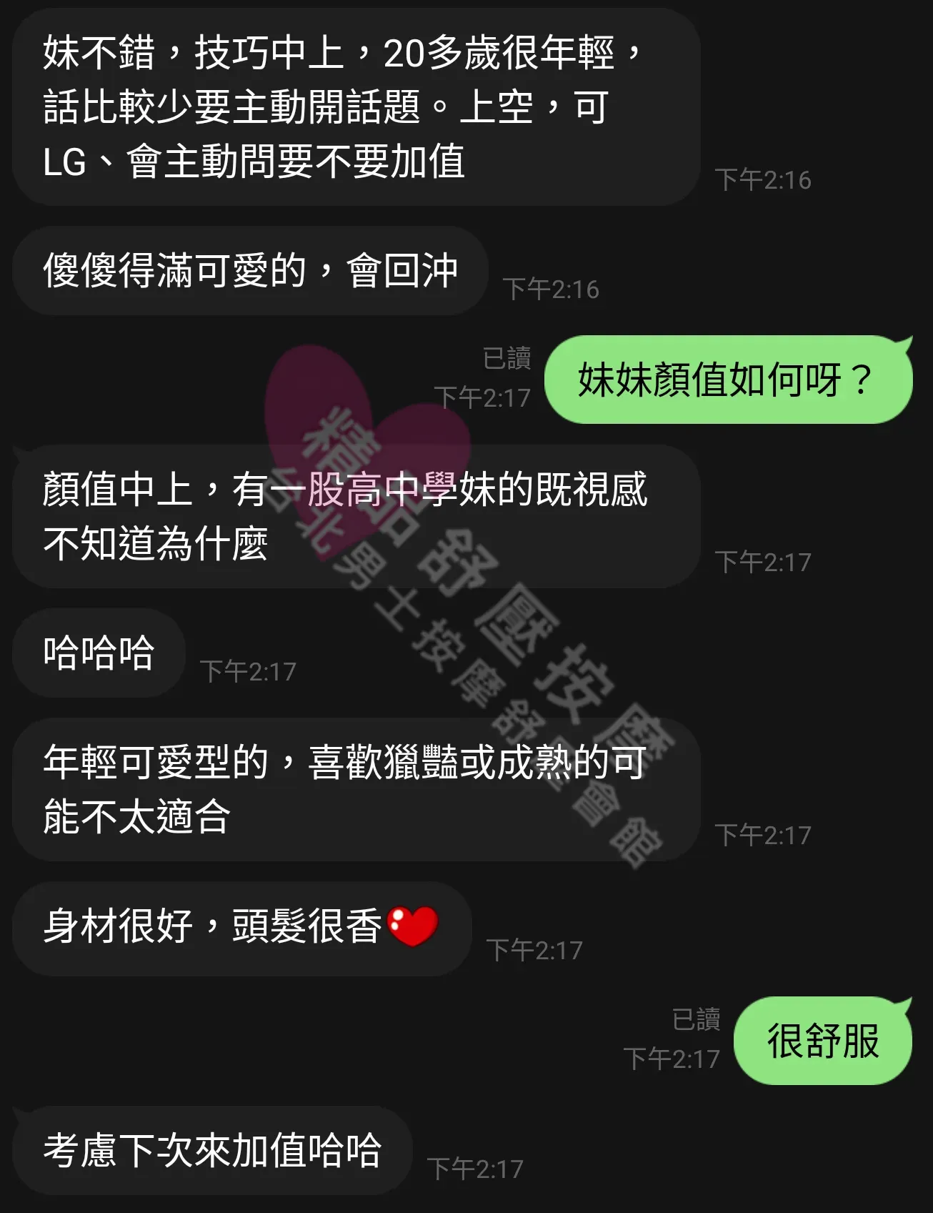 美容師都很有禮貌,先幫你背部按摩聊聊天,前戲會開始調情輕功,再來就是重點部位的加強。如果預算,也可以跟美容師聊聊加值服務,放心問都有機會。精品舒壓期待每位客人每次來舒壓都有個Happy Ending!