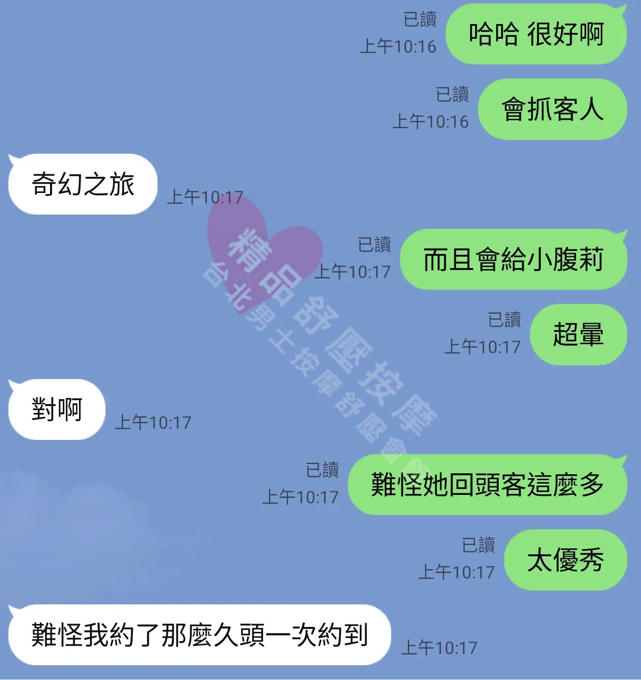 美容師都很有禮貌,先幫你背部按摩聊聊天,前戲會開始調情輕功,再來就是重點部位的加強。如果預算,也可以跟美容師聊聊加值服務,放心問都有機會。精品舒壓期待每位客人每次來舒壓都有個Happy Ending!